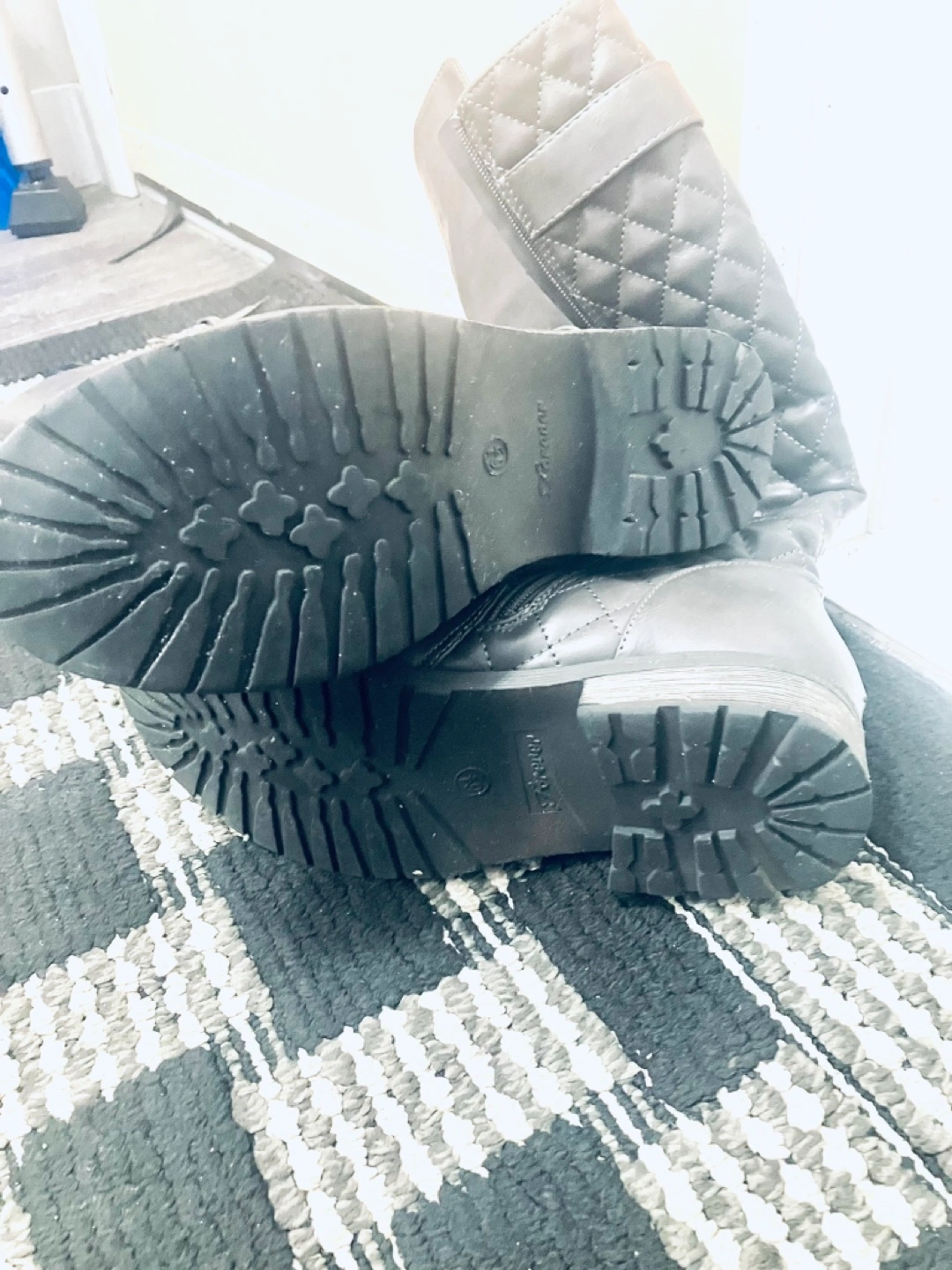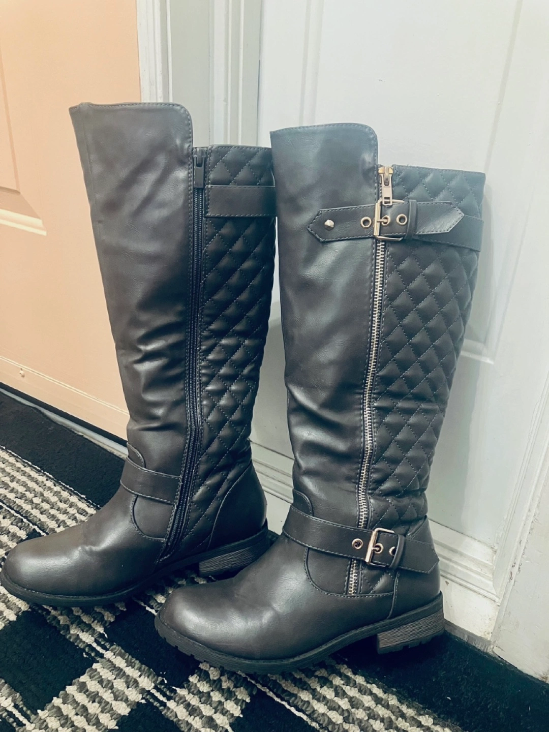 quilted knee high boots with a side zipper and buckle detail. They are in EXCELLENT condition.