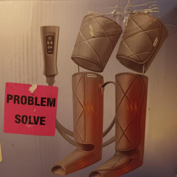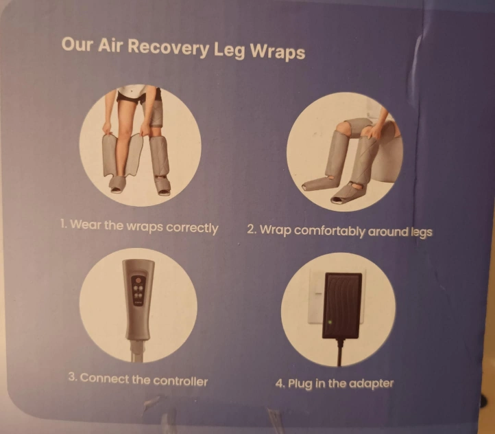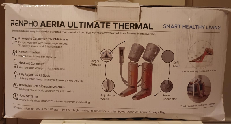 Leg massager with heat and air compression. Includes foot and calf wraps, thigh wraps, handheld controller, power adapter, and travel storage bag.