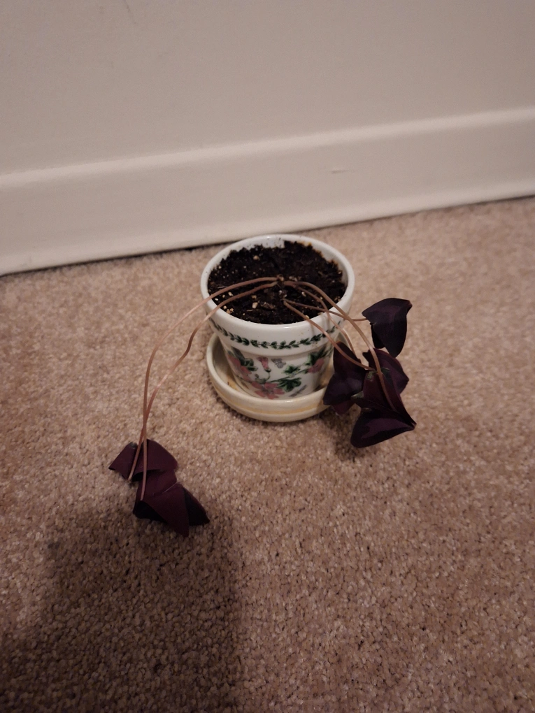 Small purple shamrock plant in a pot. The plant has a few leaves and looks like it needs some care. The pot is decorated with green and pink floral patterns.