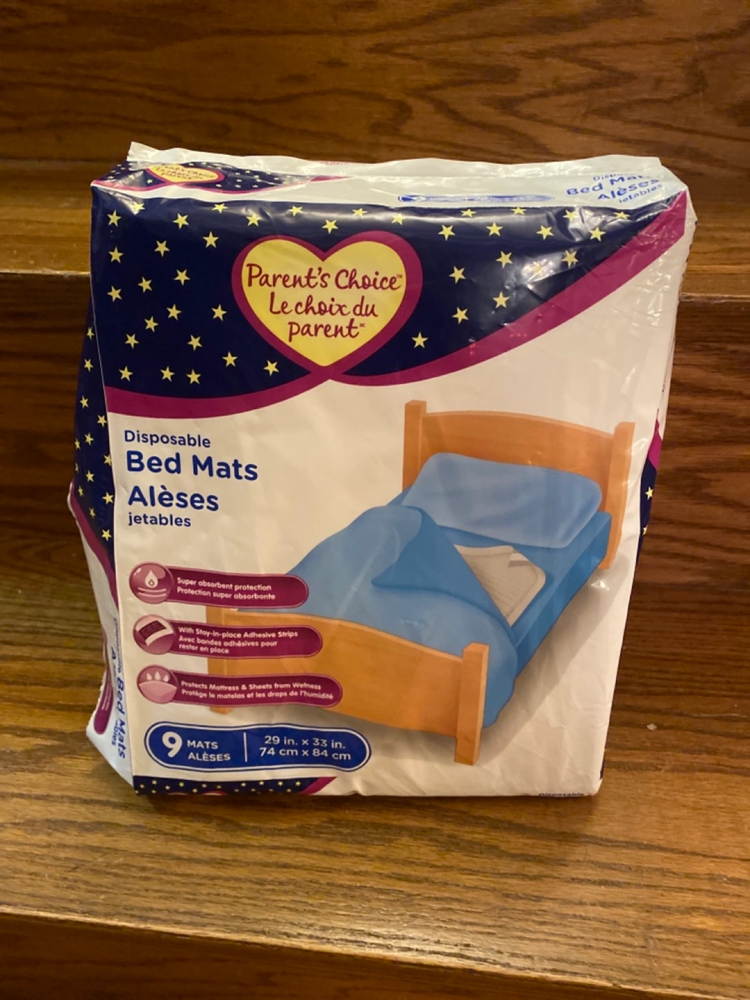 Package of 7 bed mats. Super absorbent protection. With stay-in-place adhesive strips. Protects mattresses and sheets from wetness. The pack had 9, but has been opened and there are 7 remaining.
