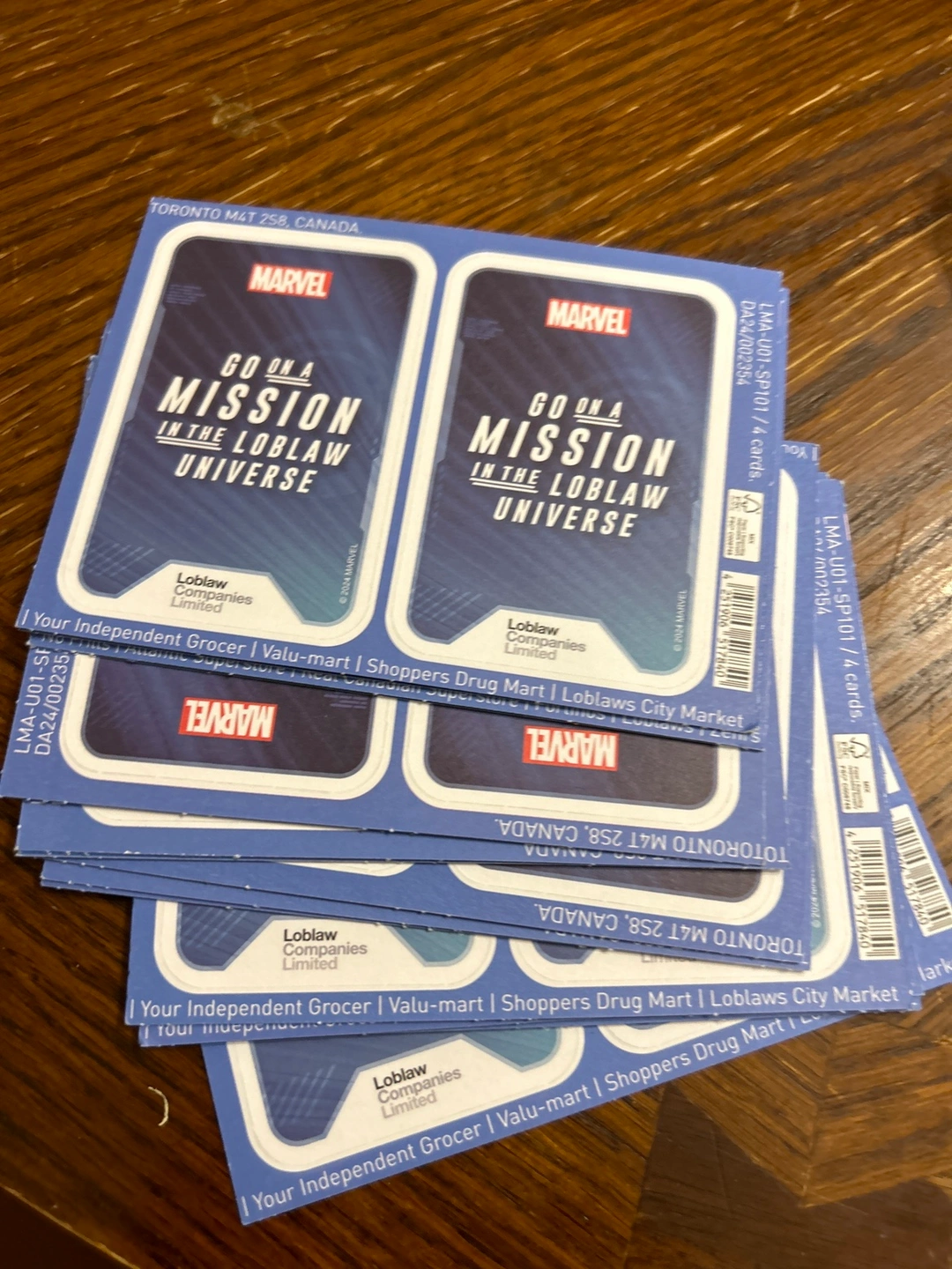 Cards featuring Marvel characters. Loblaw Companies Limited branding.