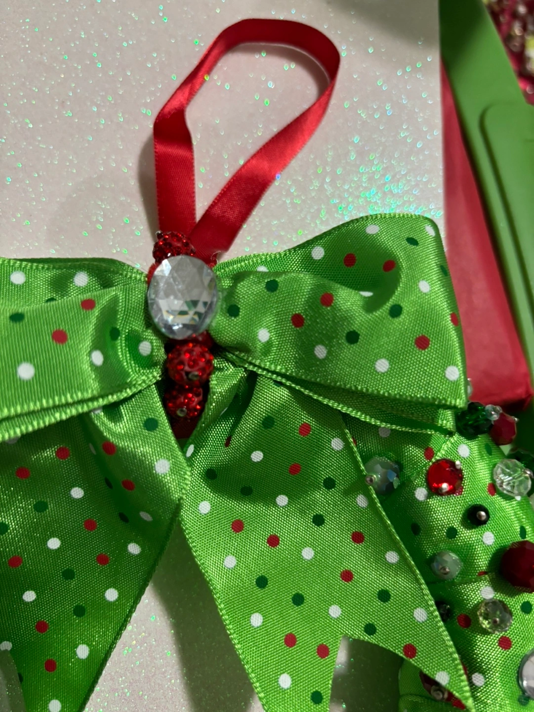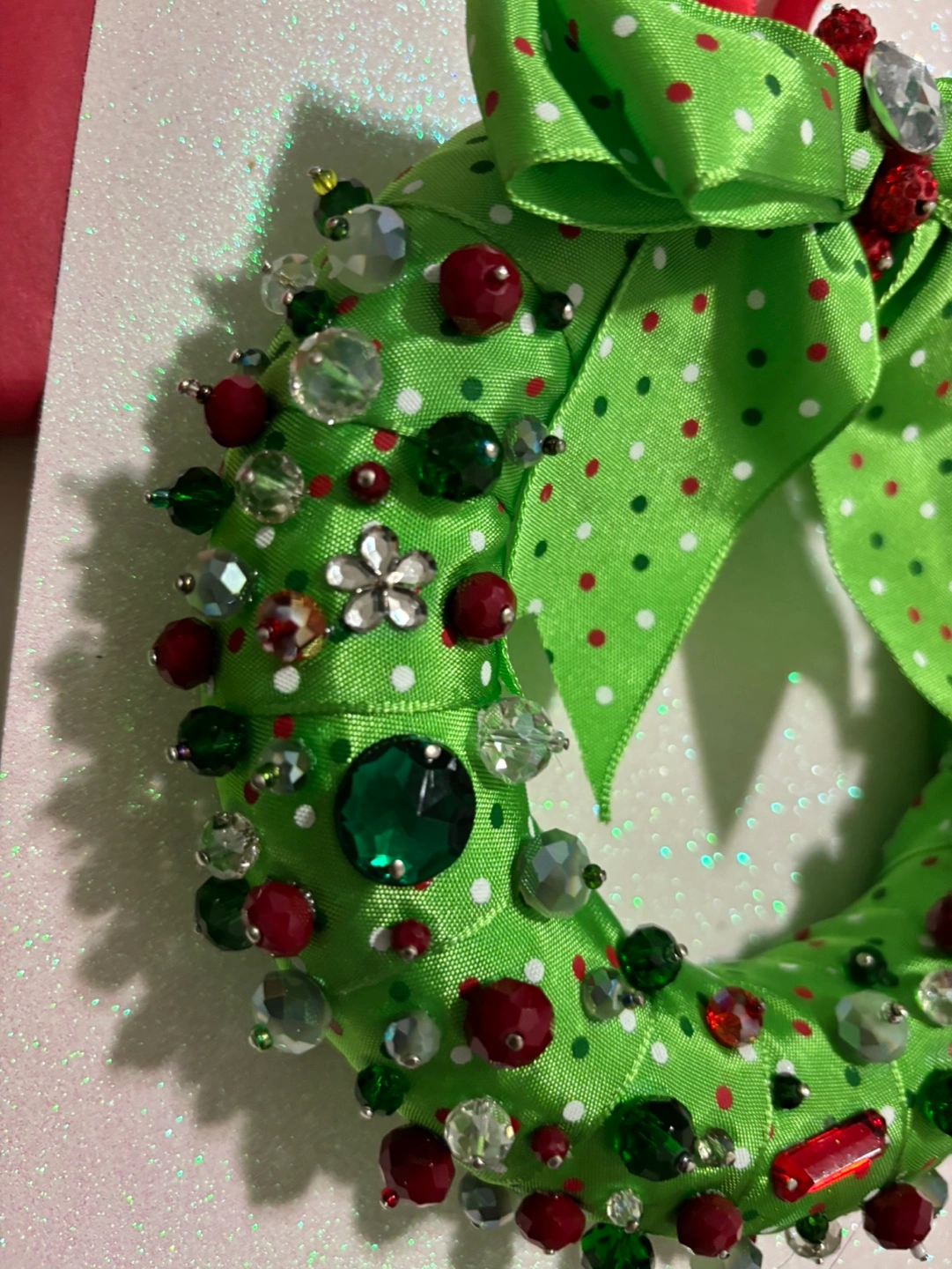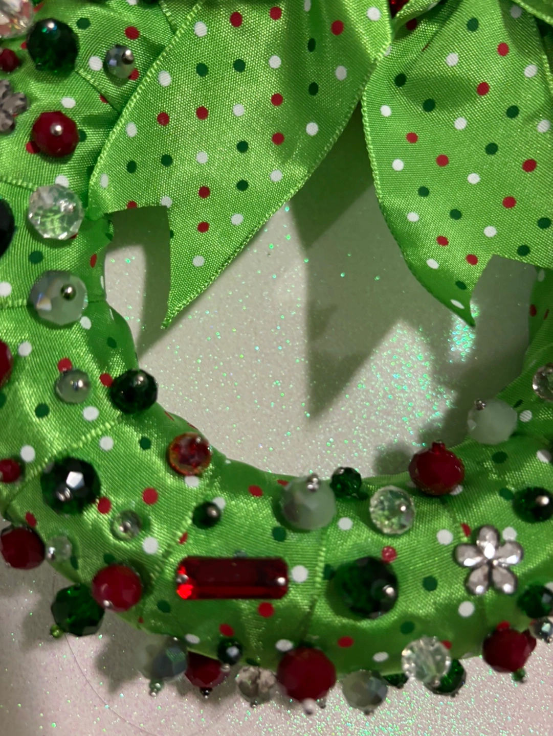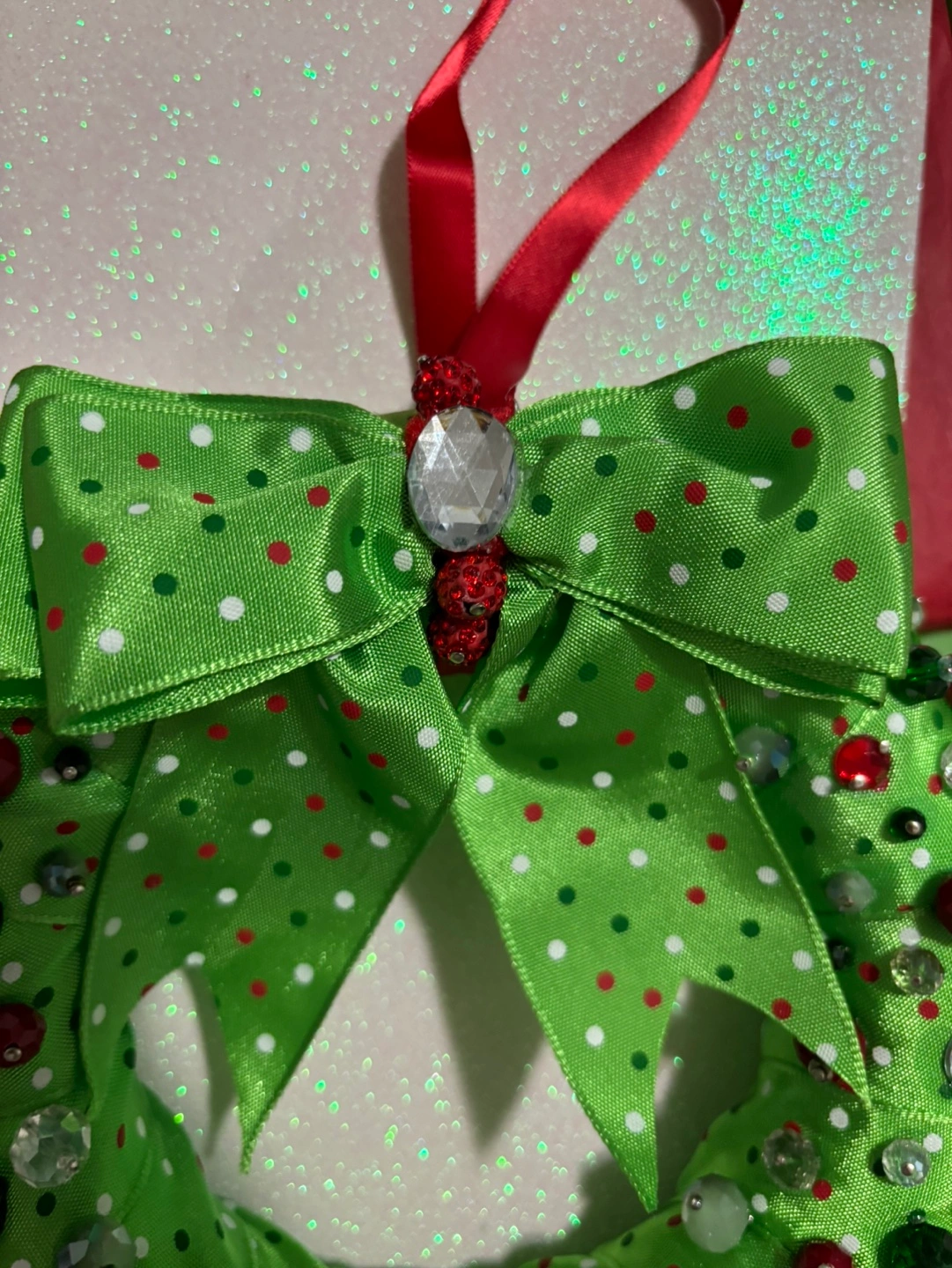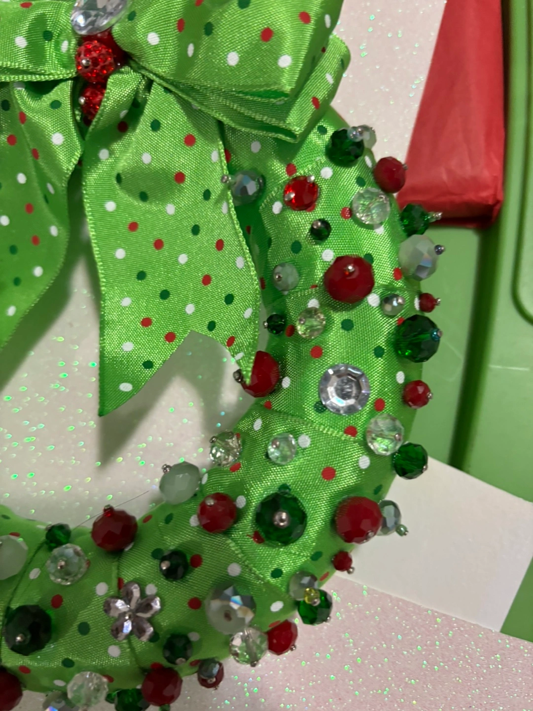 Small Christmas wreath with green and red ribbon and various coloured beads. Has a red ribbon for hanging. Pickup in Mississauga