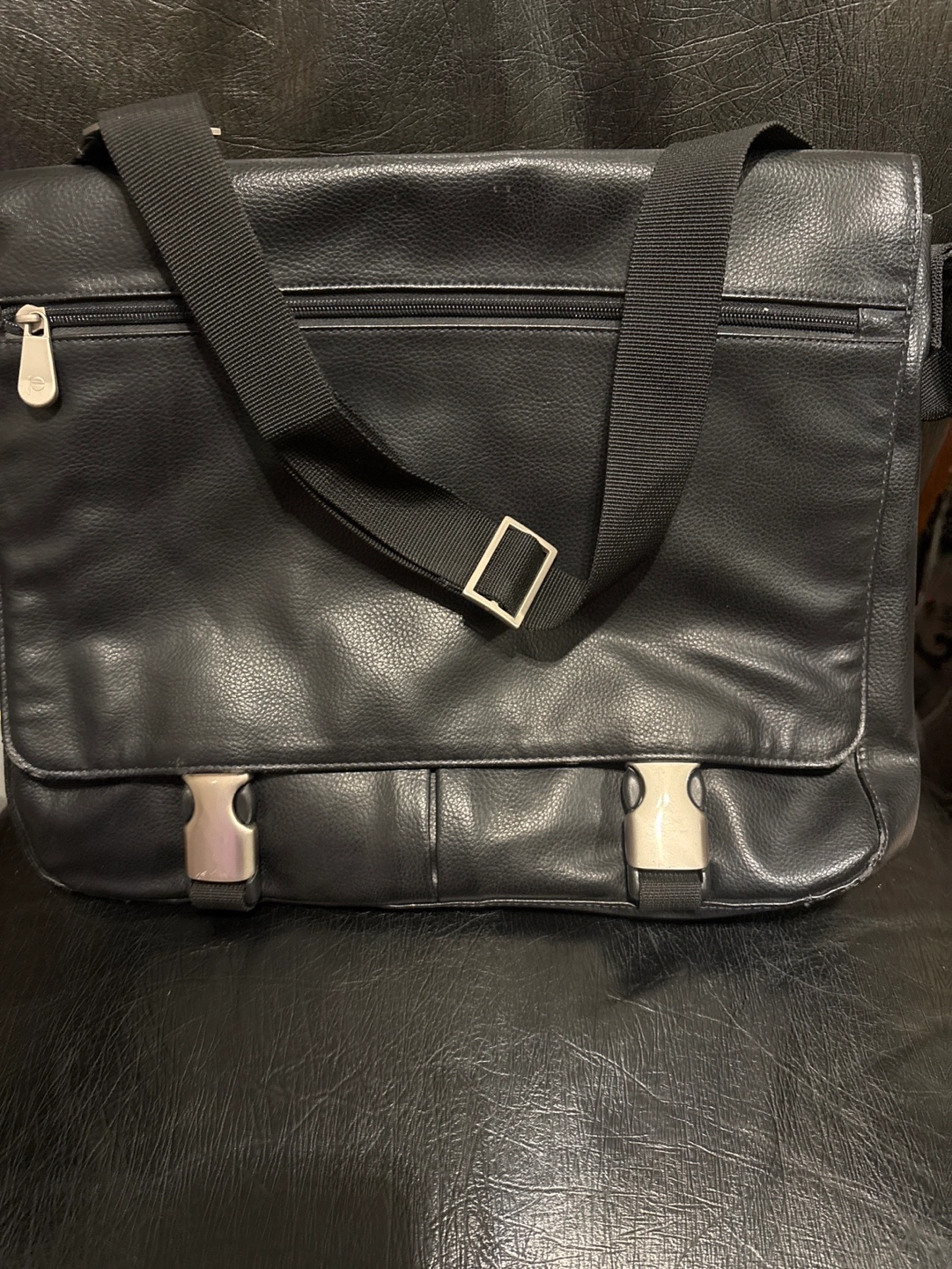 Black leather messenger bag with an adjustable strap. Features a zipper closure and two silver buckles. Awesome condition Available by appt for pick up at 1421 Bloor Street West - inside Martin Espresso Cafe