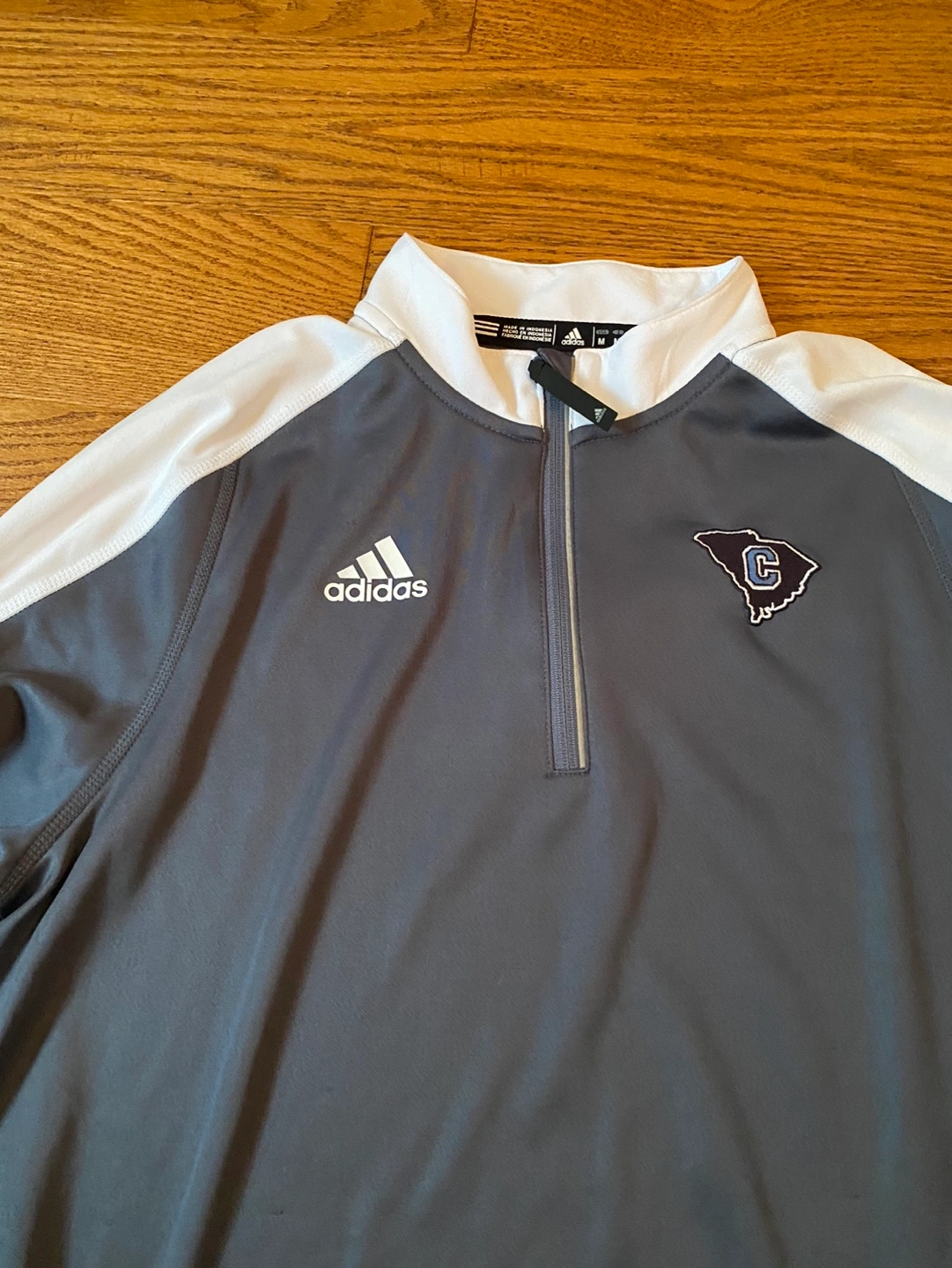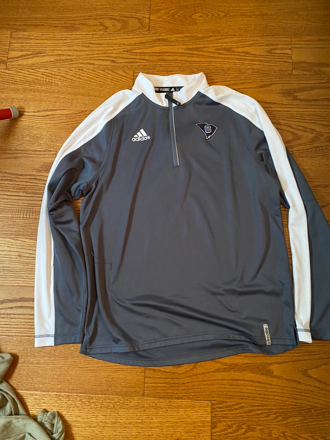 Grey and white pullover with a 1/4 zip. Adidas logo on the left.
