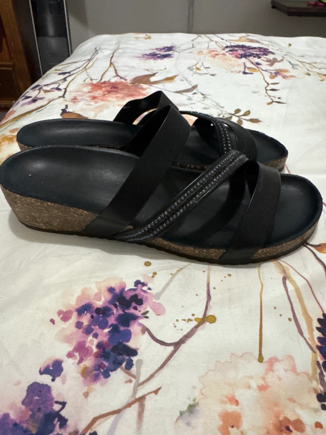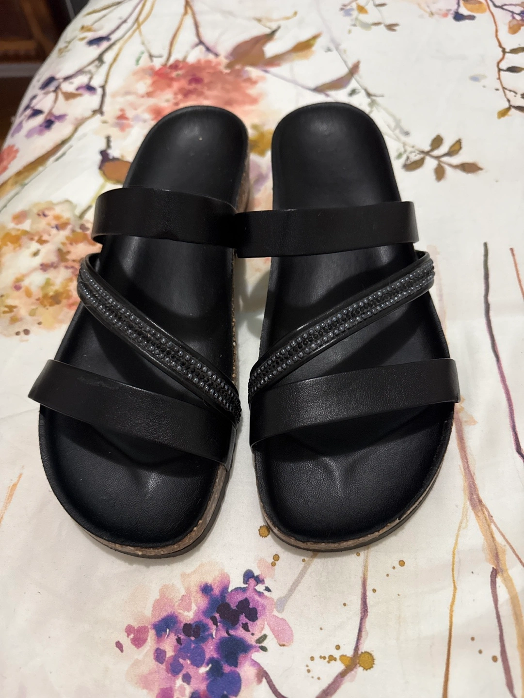 Black leather sandals with a cork wedge and beaded detailing. Made in Italy. Very good condition.