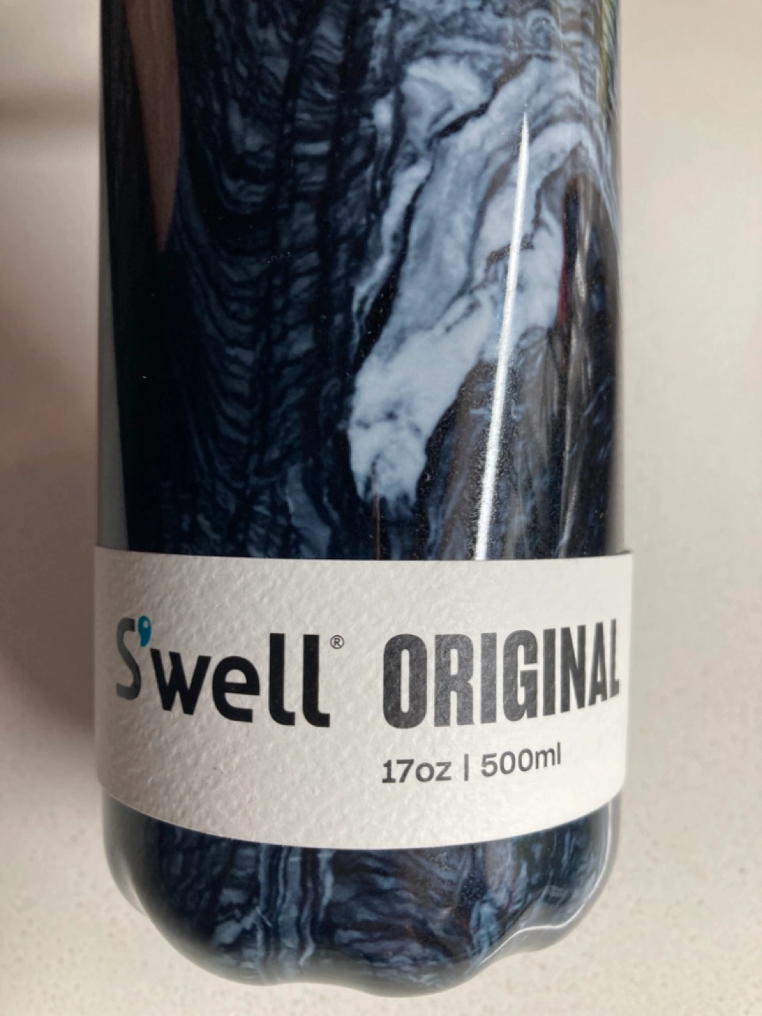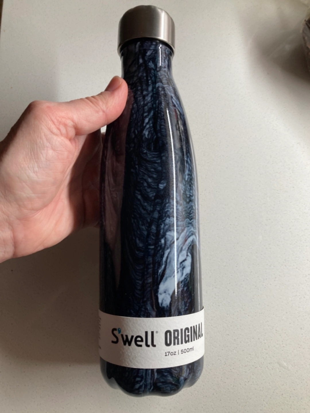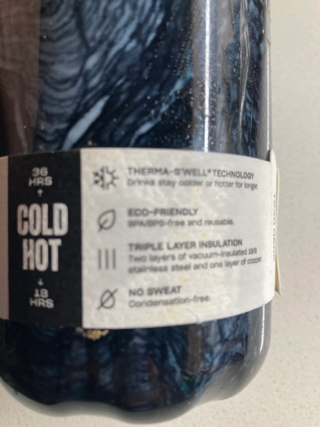 Giftable! For hot and cold liquids, triple-insulated and will not swear. Lightweight, withtasteful, dark blue marbled pattern.