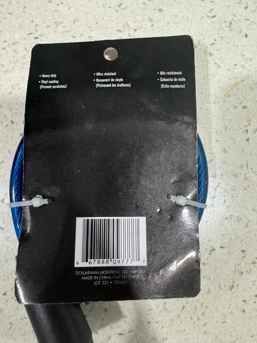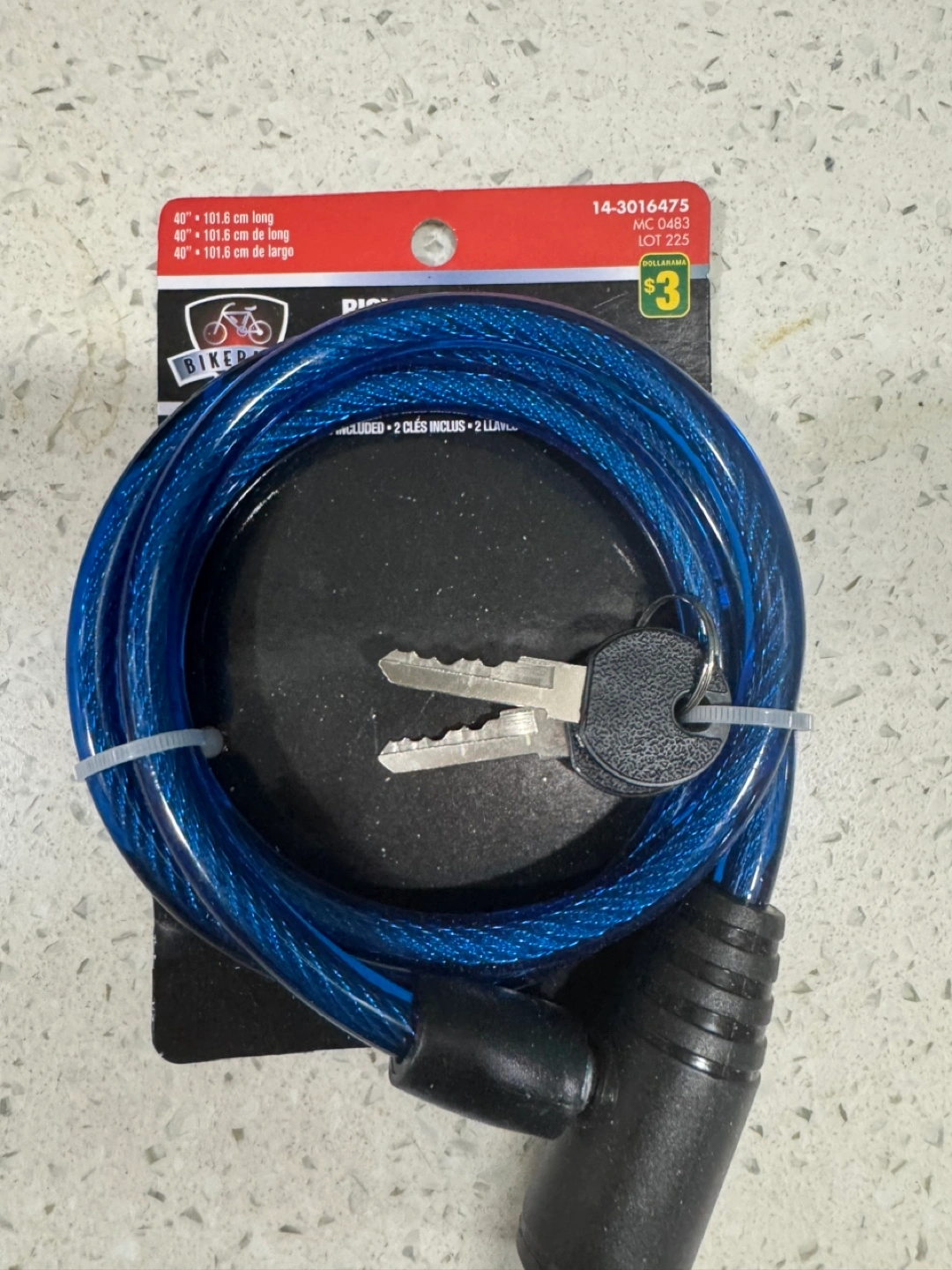 Blue bike lock, 40 inches long, with two keys. Heavy duty, vinyl coating, ultra resistant.