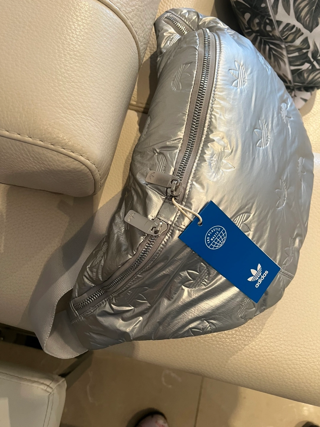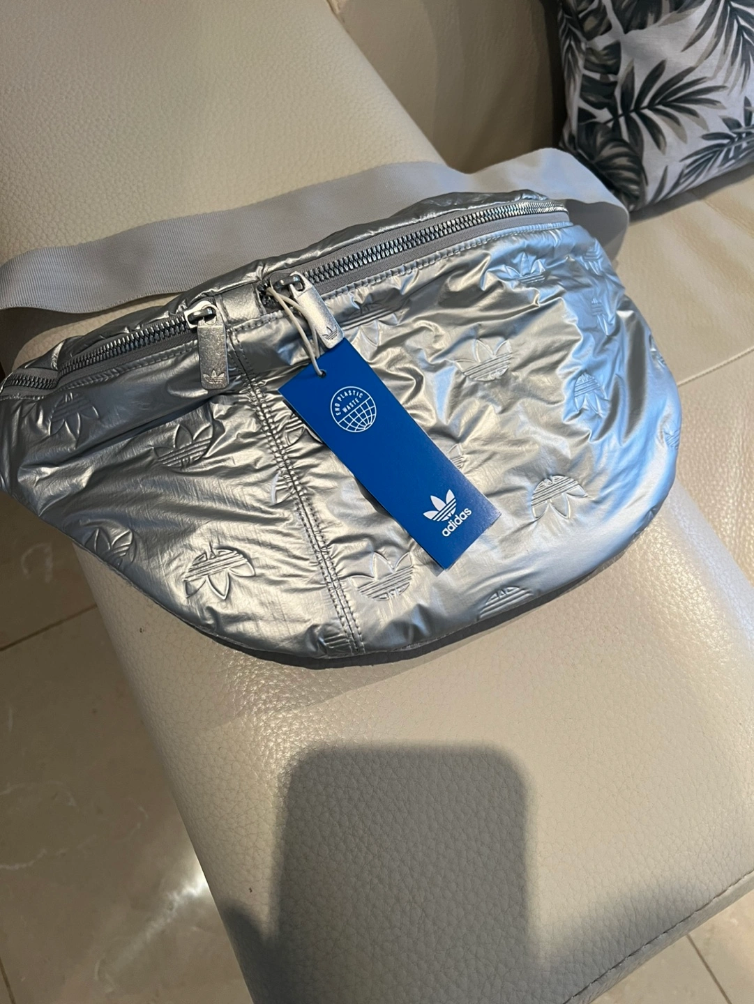 Silver Adidas fanny pack. Embroidered with the Adidas logo.