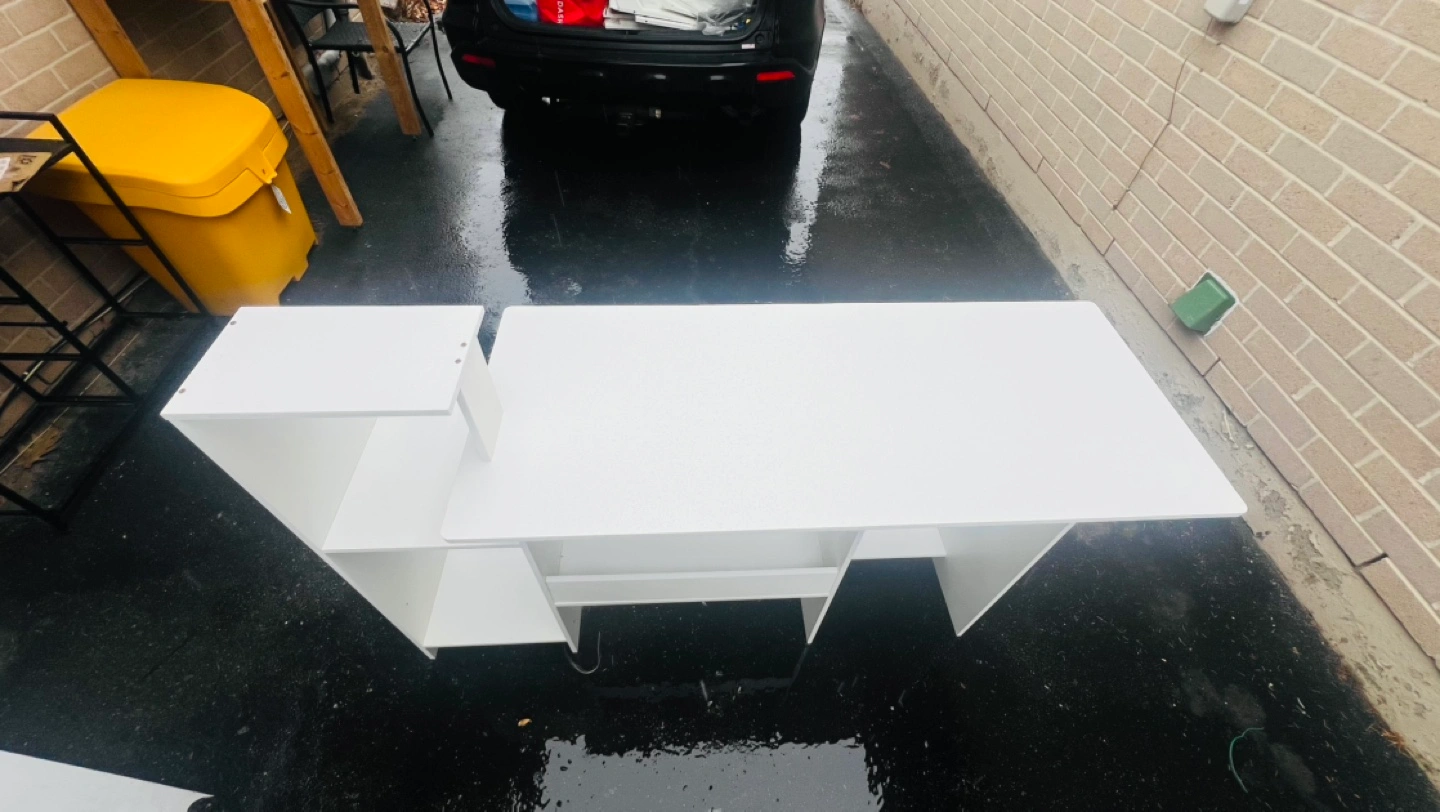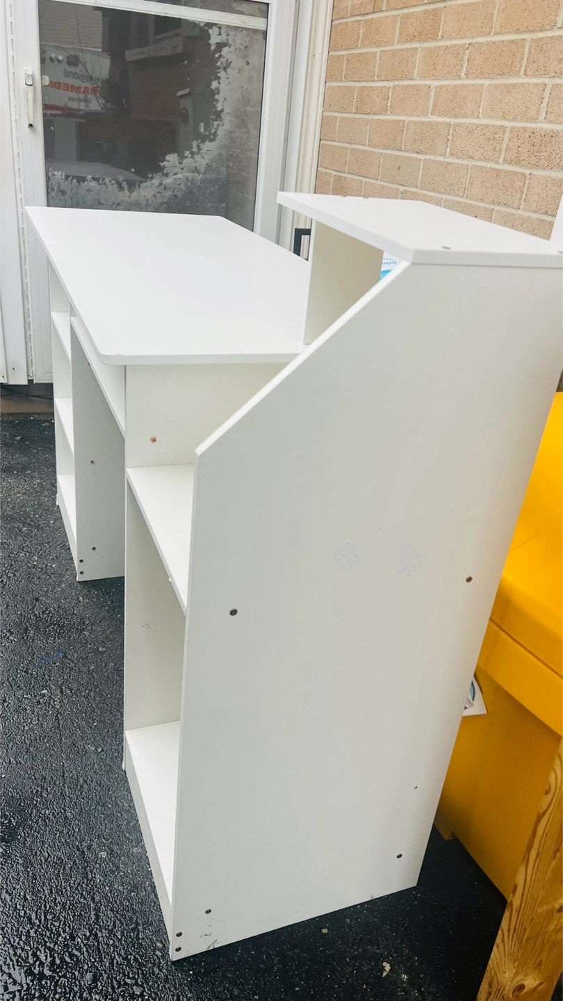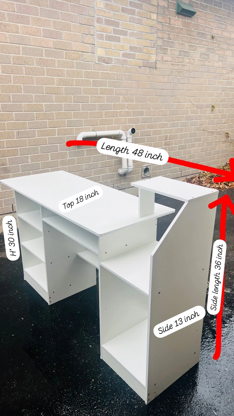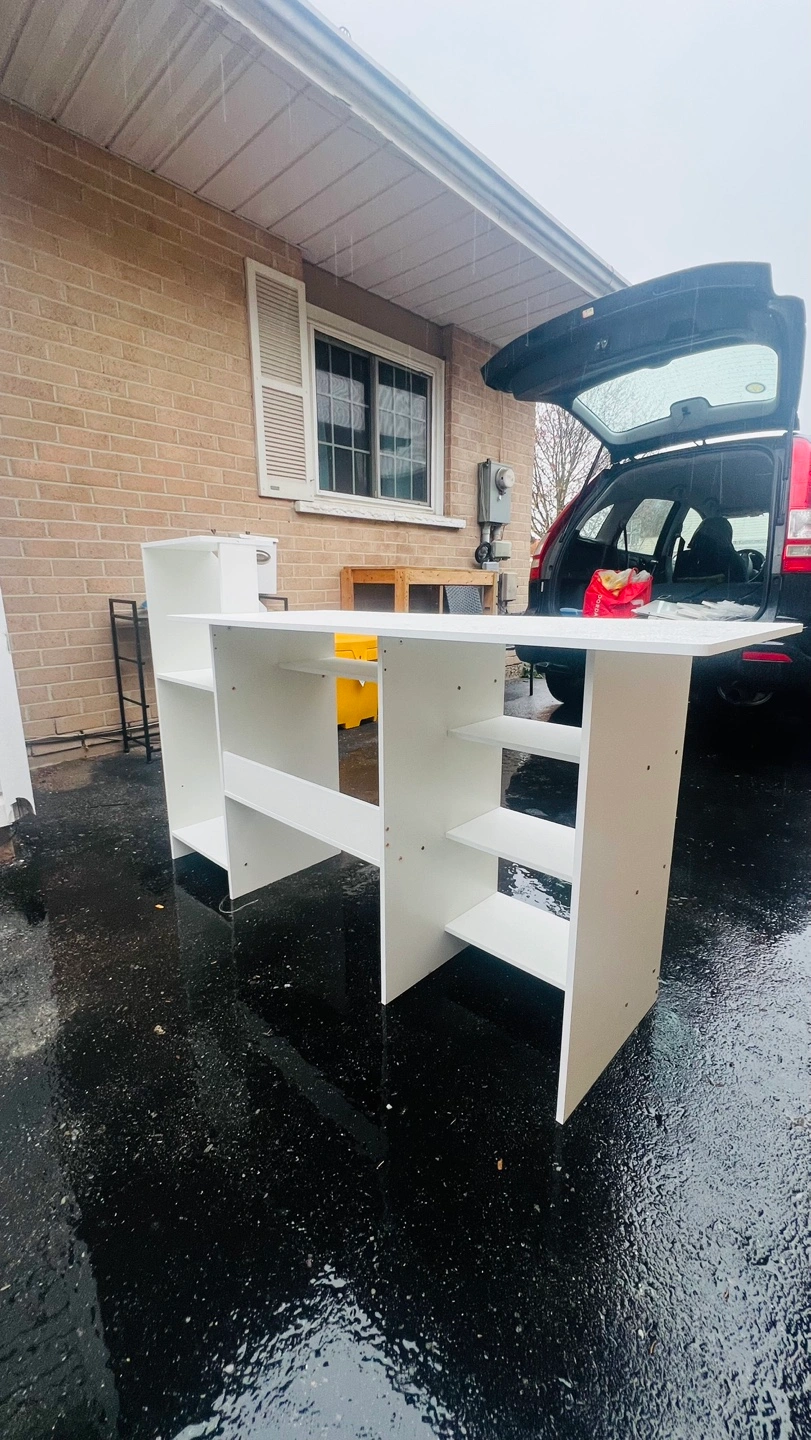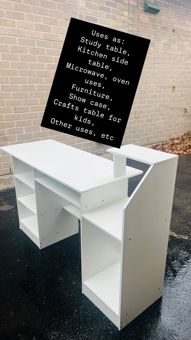 White Countertop/Desk with Shelves. Can be used as a study table, computer table, work from home, professional uses, tutor uses, kitchen side table, microwave, oven, or other furniture. Great for crafts, kids, or a show case. Can be fit into SUV trunk. Easy movable. Never used.
