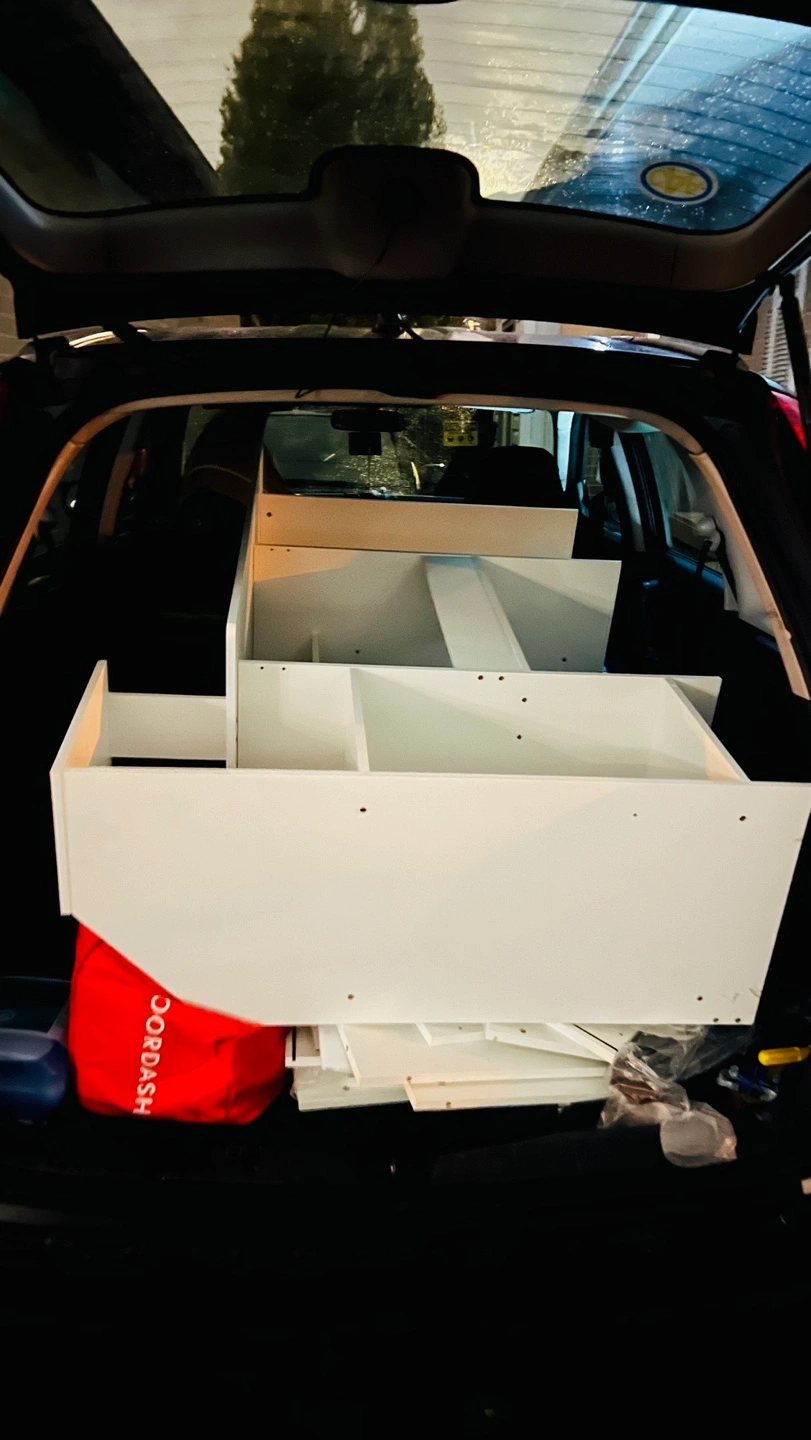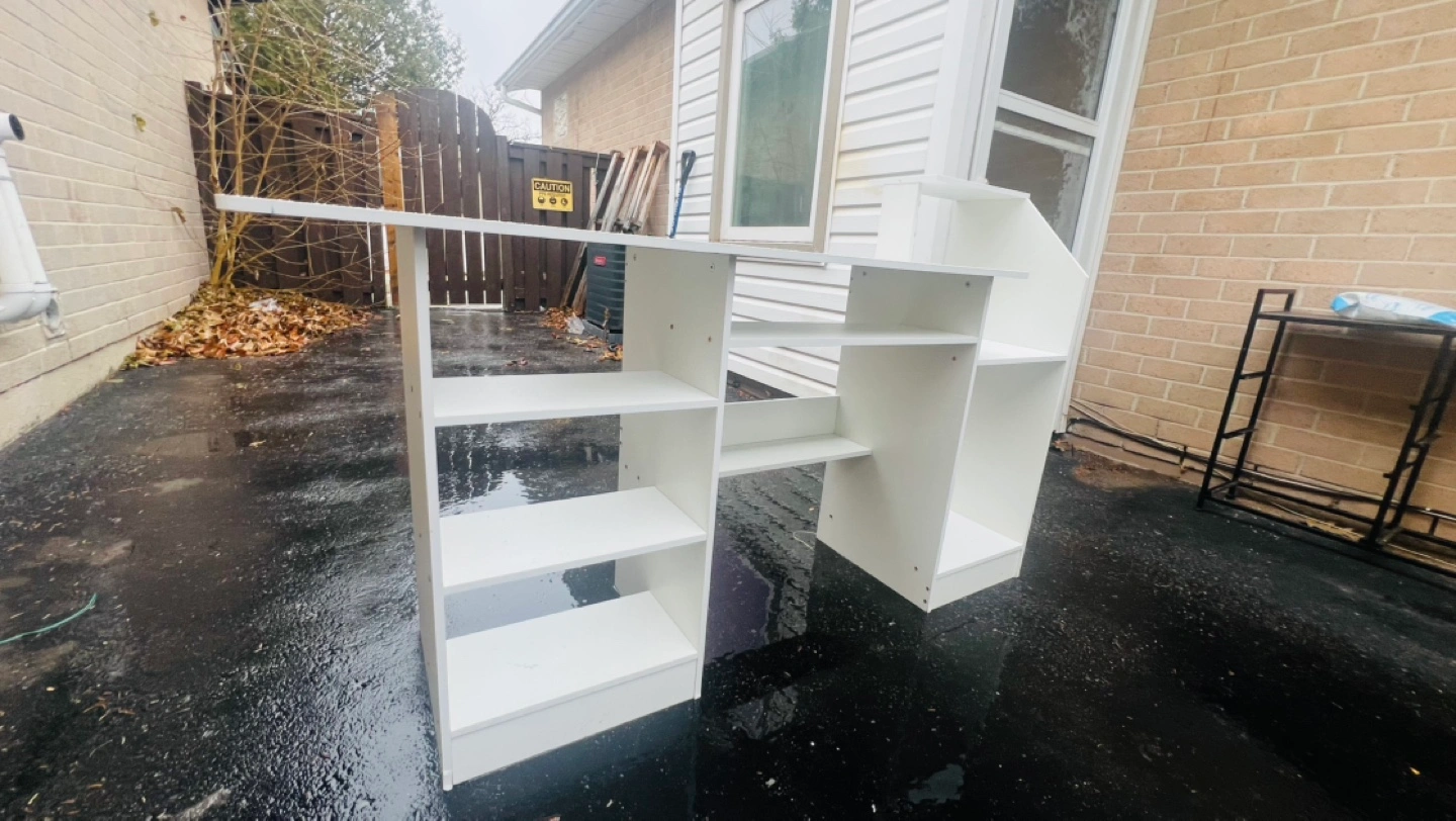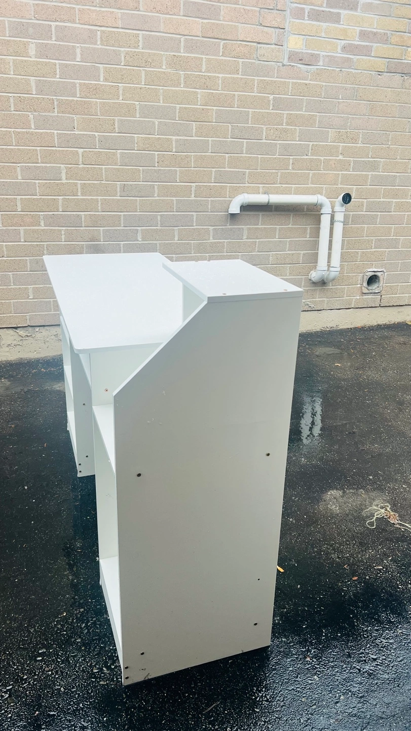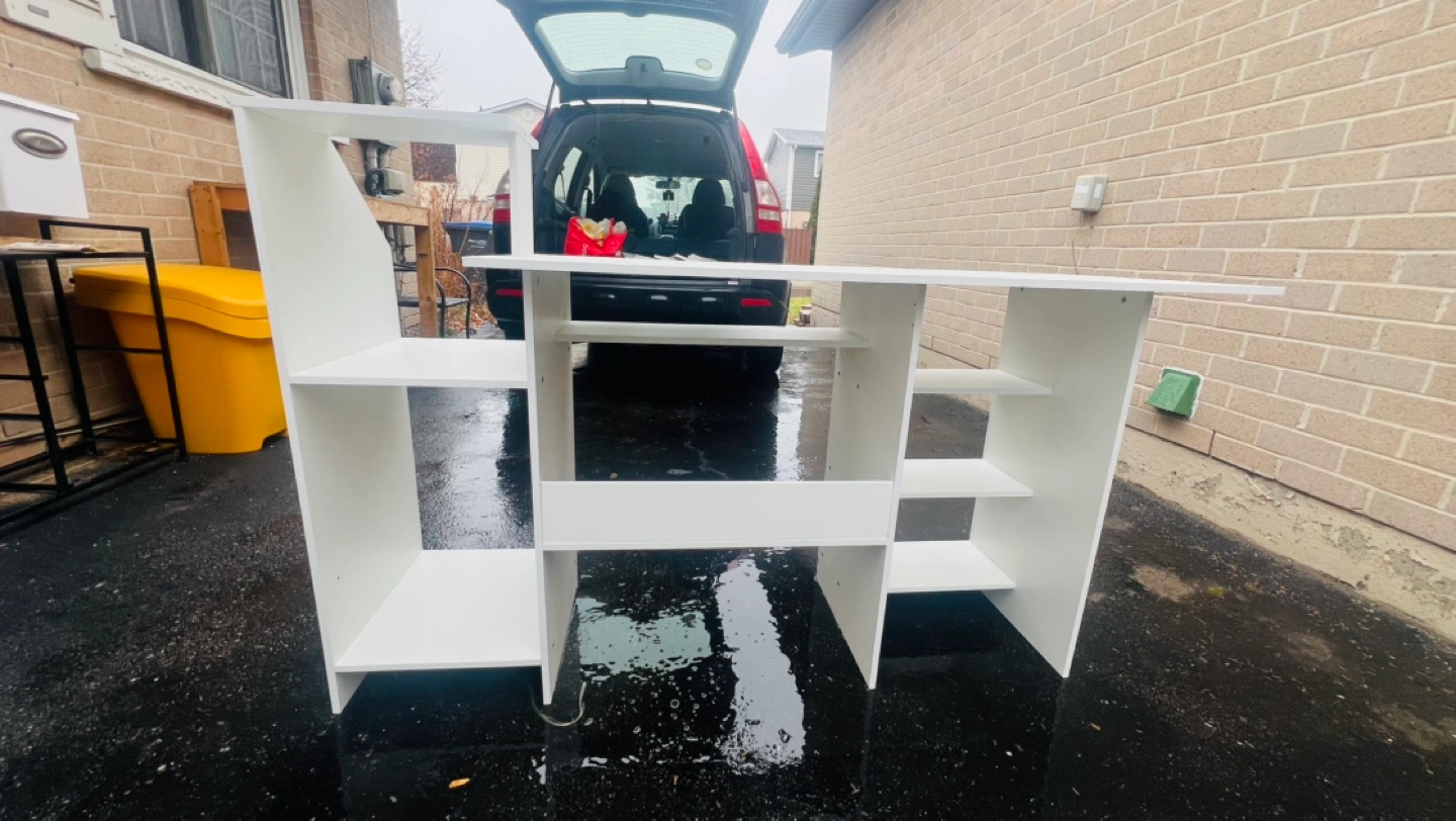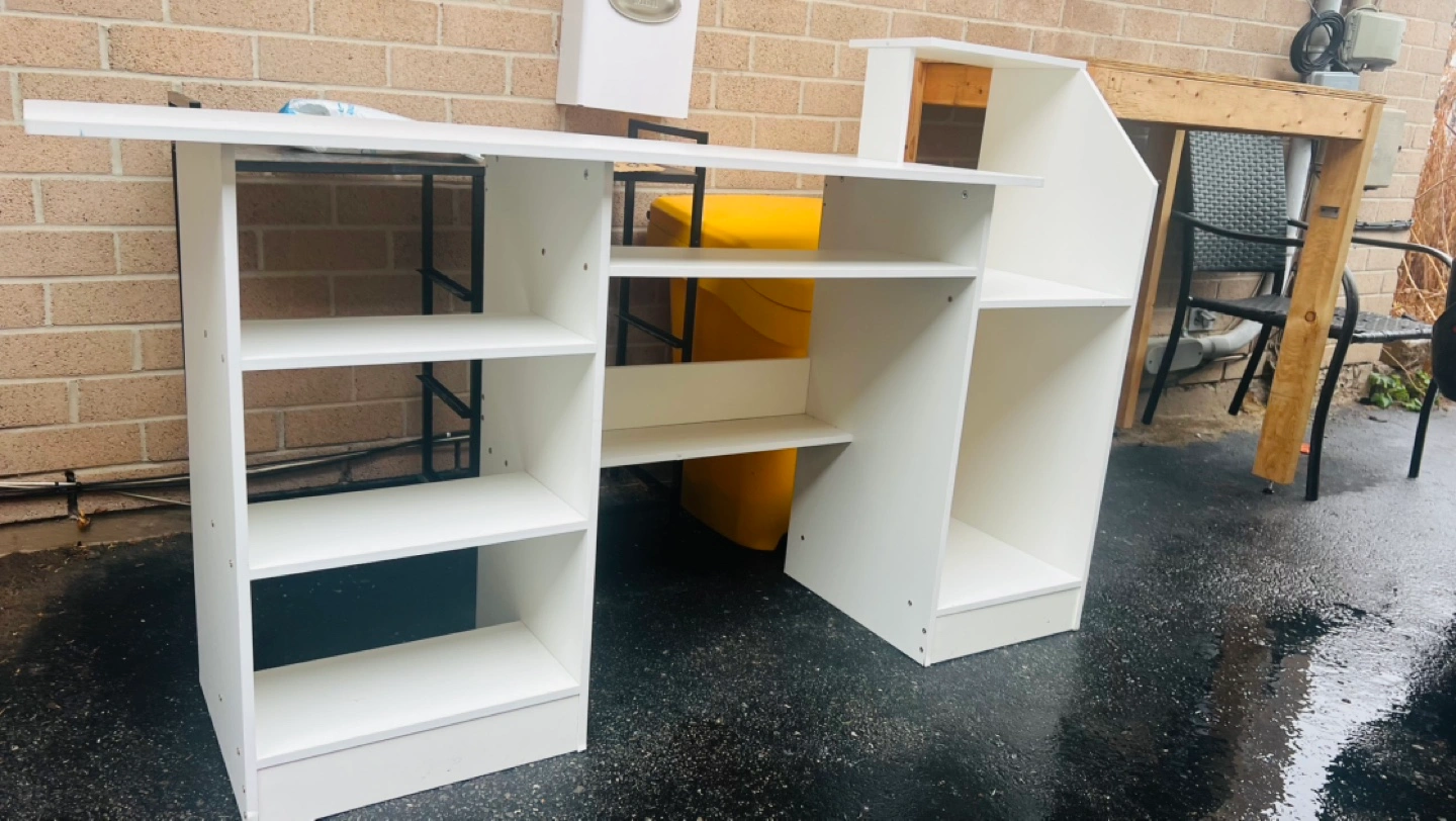 White Countertop/Desk with Shelves. Can be used as a study table, computer table, work from home, professional uses, tutor uses, kitchen side table, microwave, oven, or other furniture. Great for crafts, kids, or a show case. Can be fit into SUV trunk. Easy movable. Never used.