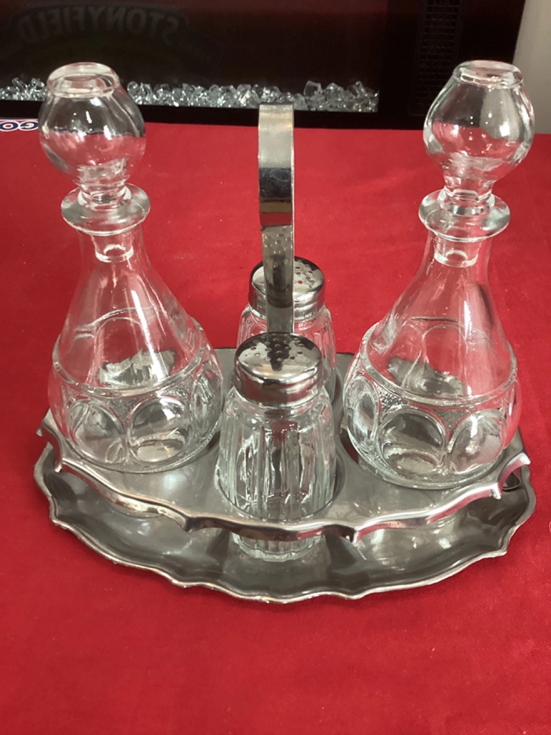 Glass oil and vinegar cruet set with salt and pepper shakers. Features a silver-tone tray with a handle. 8 and half inch in length 5 inch in the middle 6 inch with the handle. Handle is sturdy I don’t know tarnished means It is silver tone tray. Almost brand new I kept like decoration Pick up near 138 st 64 av