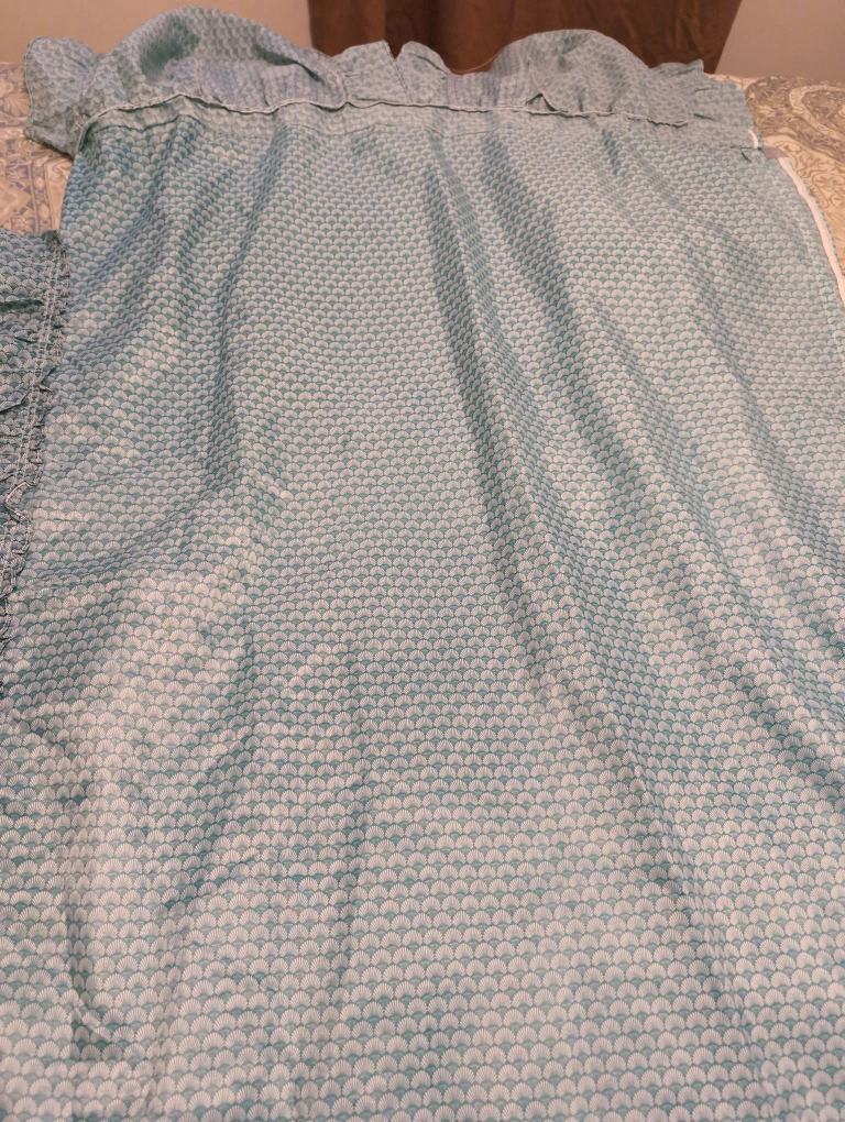 Teal valance with white fan pattern. Has ruffles along the top and bottom.
