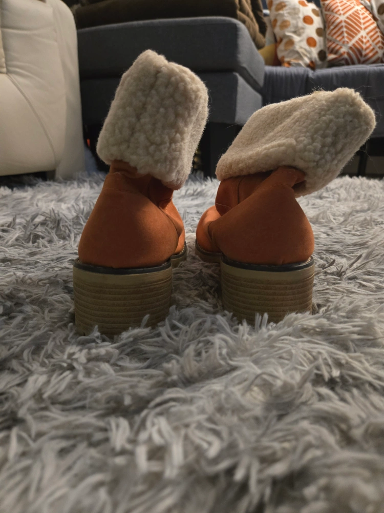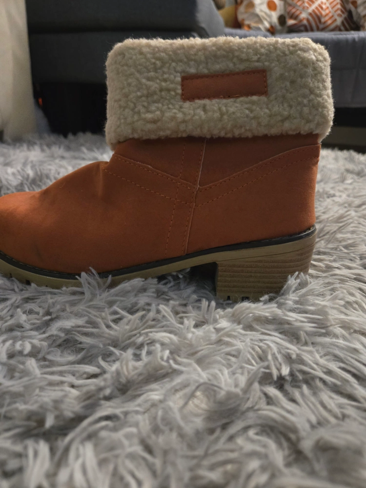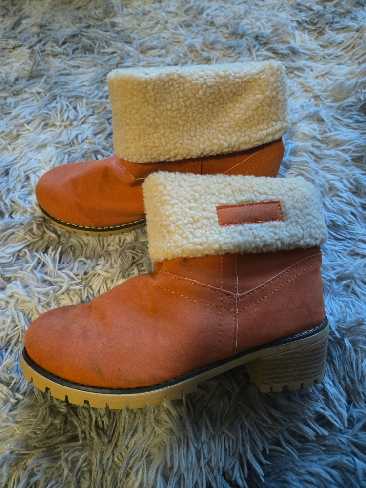 Orange faux suede boots with a faux fur cuff. Low block heel. Size 41