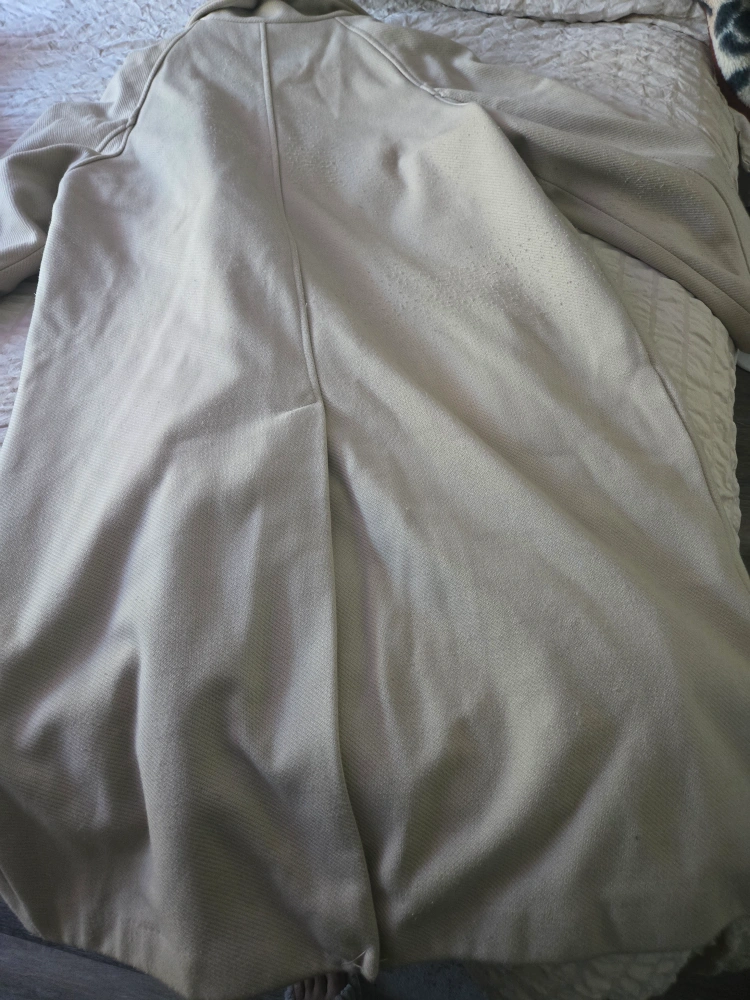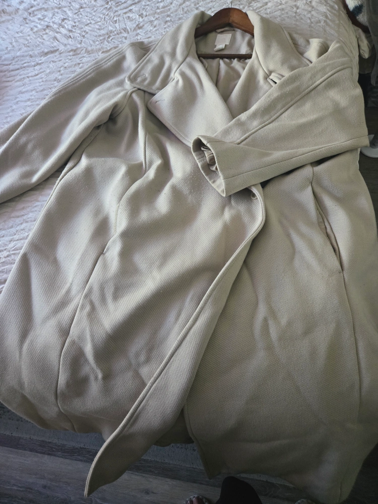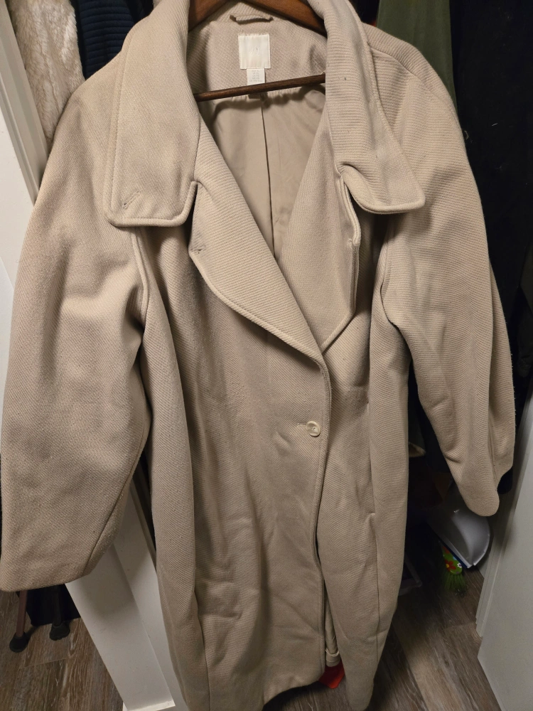 Long beige H&M coat with a two-button closure. Pockets, and a collar. High collar with button inside. Worn five times