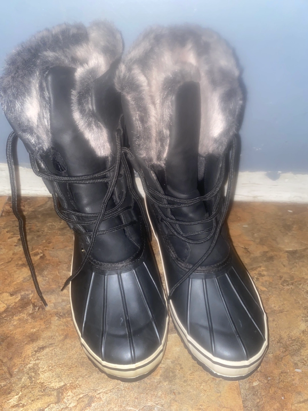 Black winter boots with fur lining and laces. They have a rubber sole.