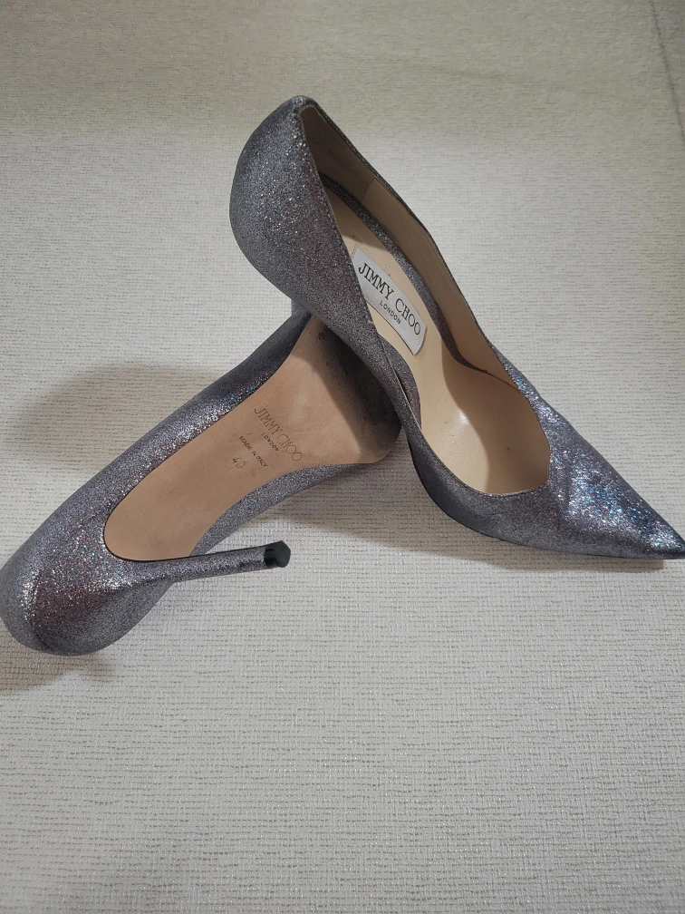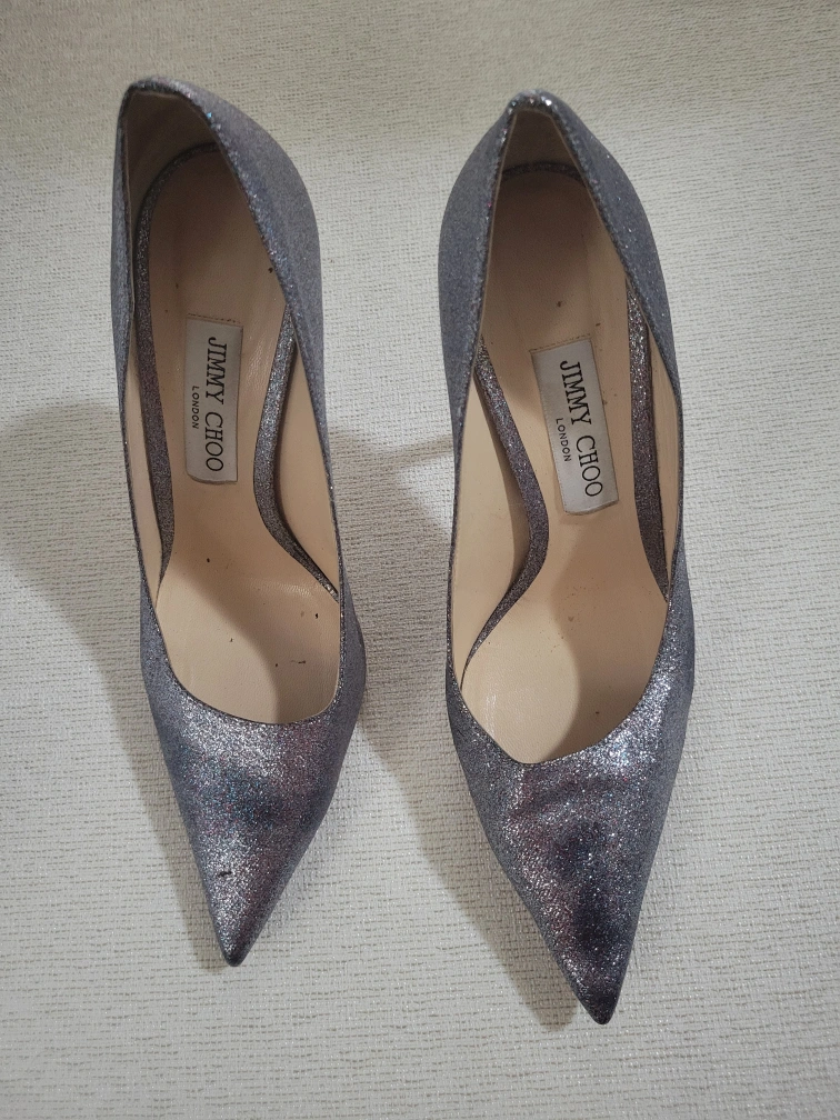 Silver glitter heels with a pointed toe. They have a stiletto heel. Size 40