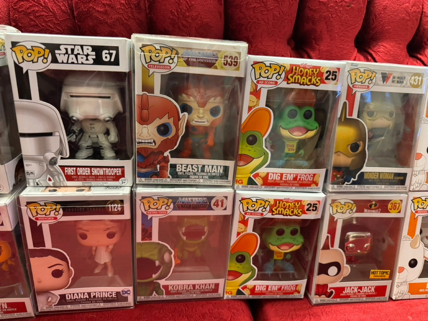 Being sold as a lot will not separate, lot of 20. Pop Vinyl figures. Includes characters from Star Wars, Masters of the Universe, Justice League, and more. All in excellent condition.