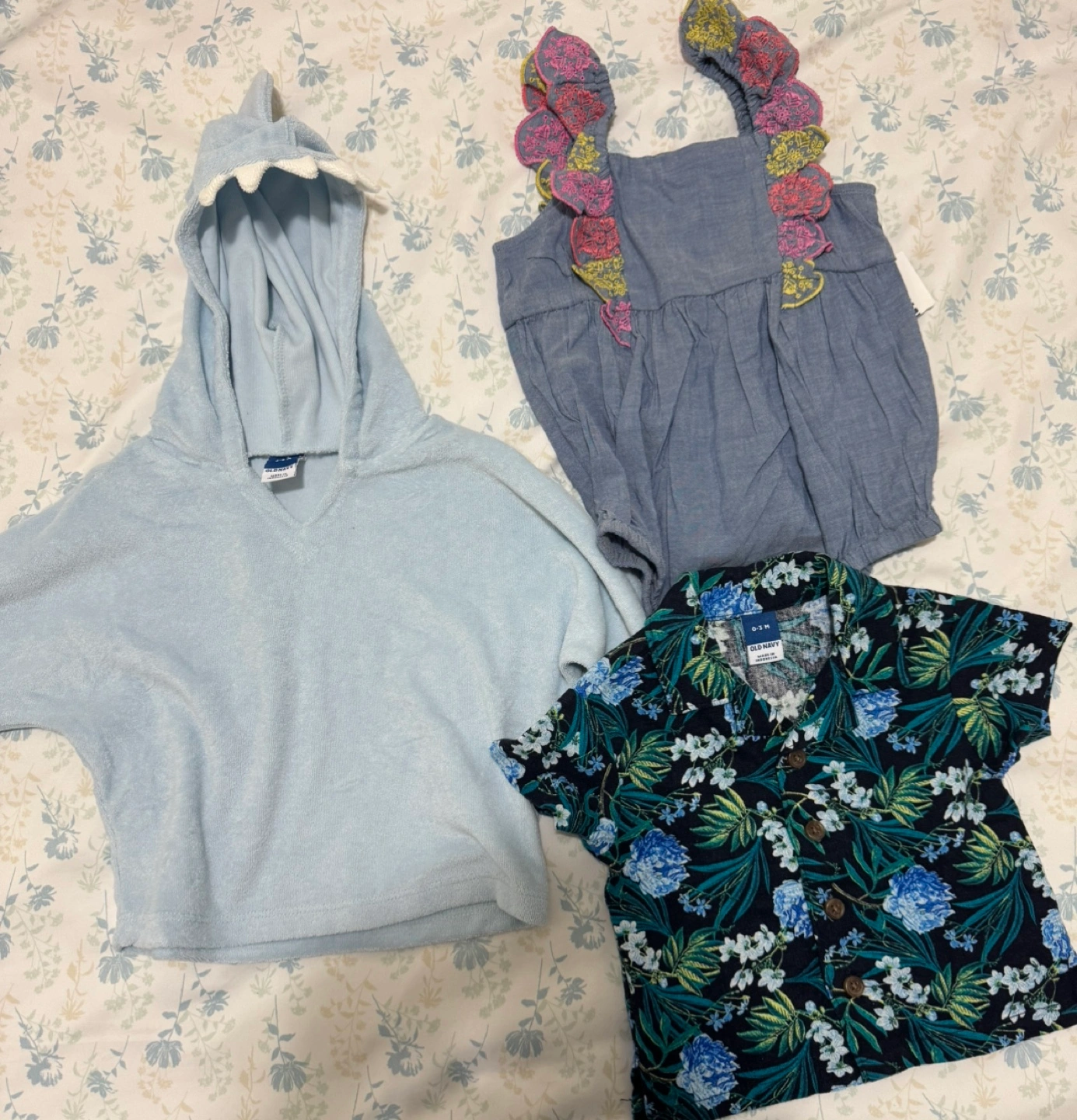 Three baby clothes - a hooded shark towel, a floral denim jumpsuit, and a Hawaiian shirt Never wore