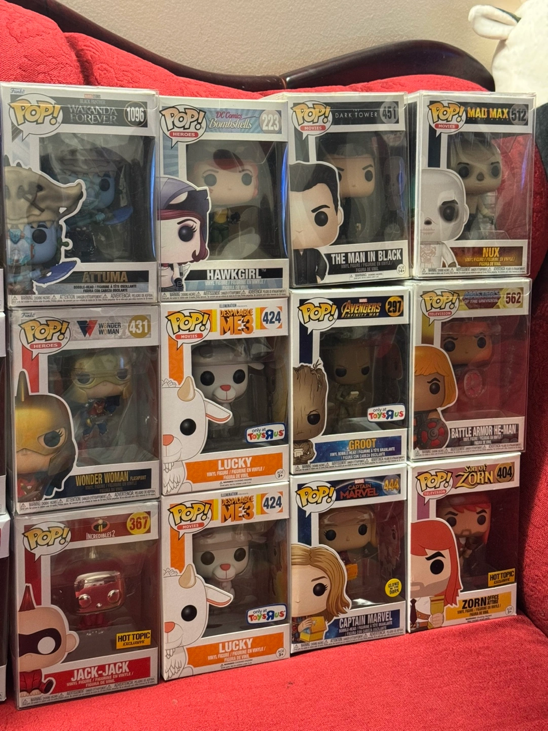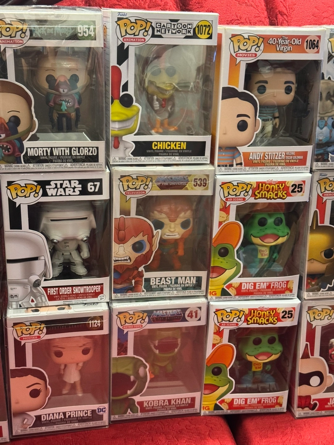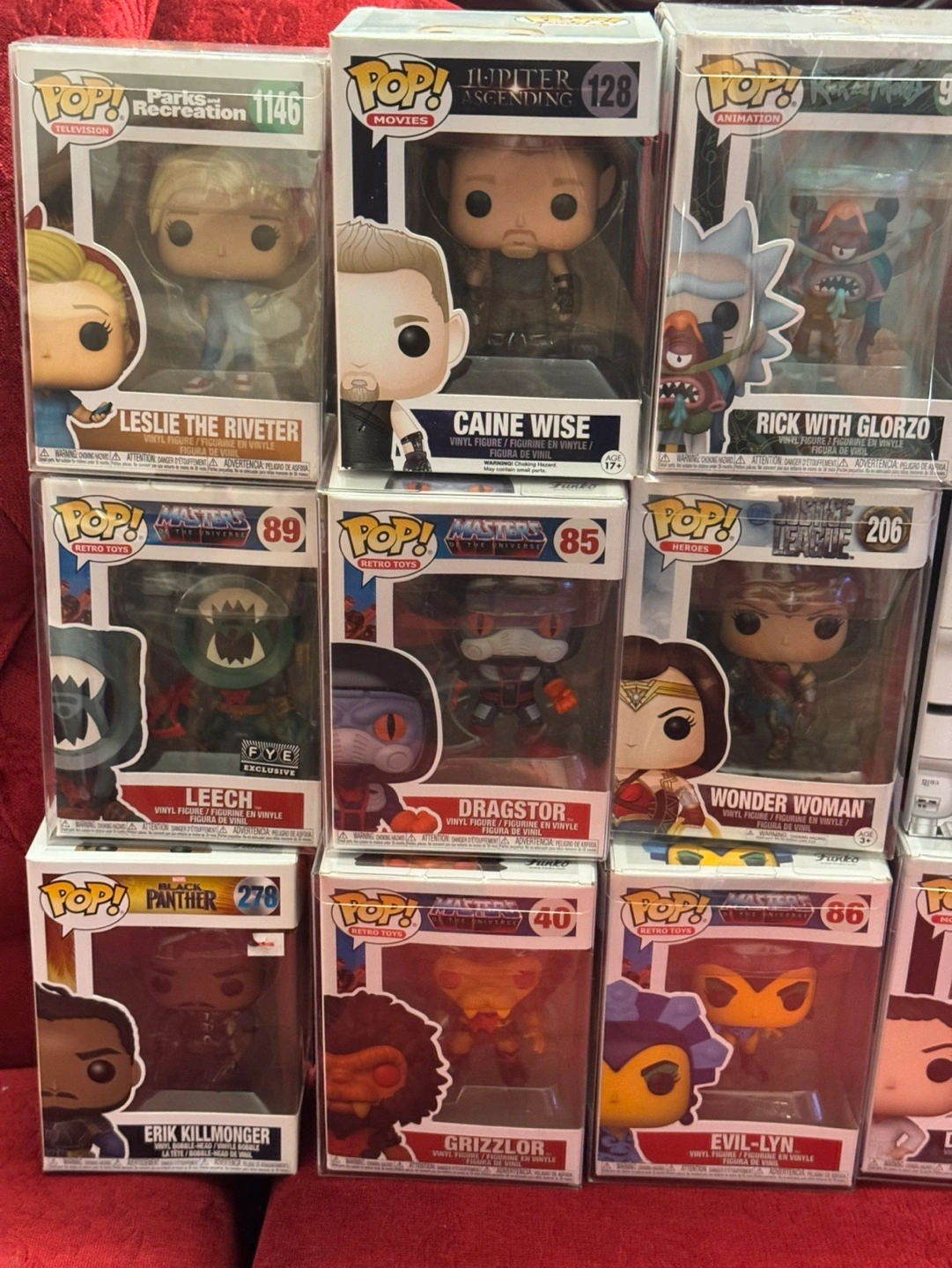 Lot of 30 Funko pops being sold as a lot. Collection of Funko Pop vinyl figures, includes various characters from movies, tv shows, and comics.