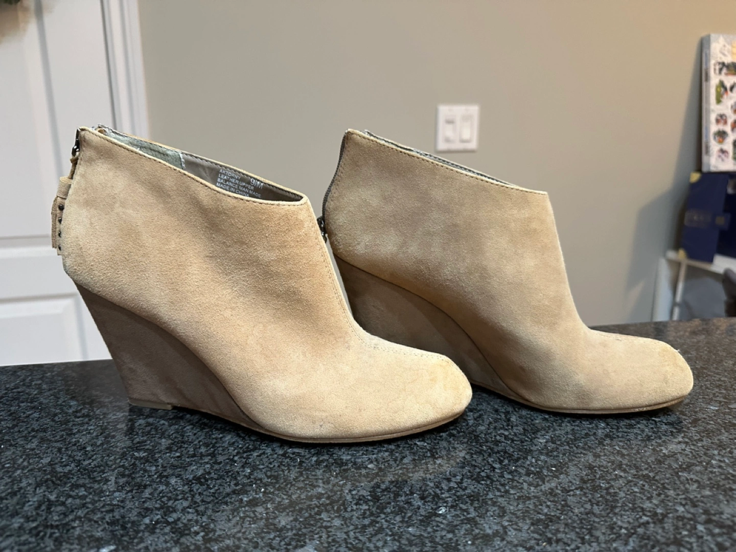 Suede wedge booties Heel zipper closure with a decorative tassel Heel height: 3.5” Size 9.5M
