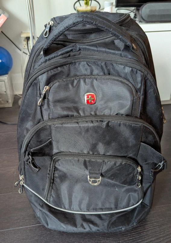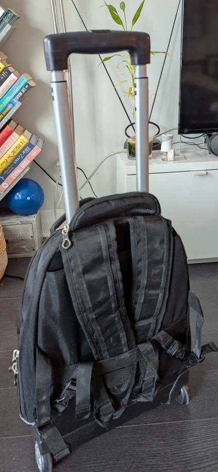 Black rolling backpack with multiple pockets. Wheels and telescopic handle. 21" in height, so eligible as carry on luggage. Capacity is around 40L-45L. Lots of pockets and dedicated laptop compartment. Originally cost $120. Located downtown at Bathurst and Lakeshore Blvd West. Pickup only. I'm usually free Wednesdays to Saturdays to meet up.