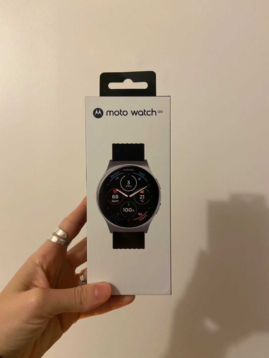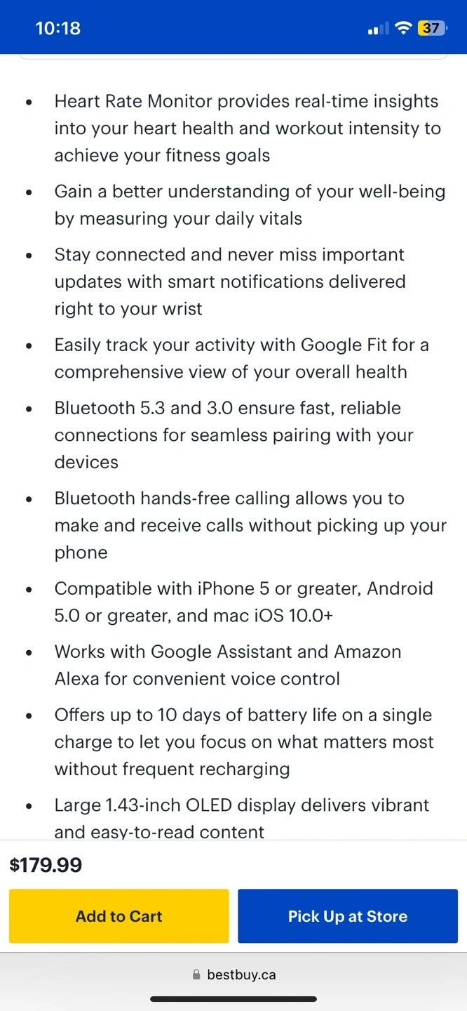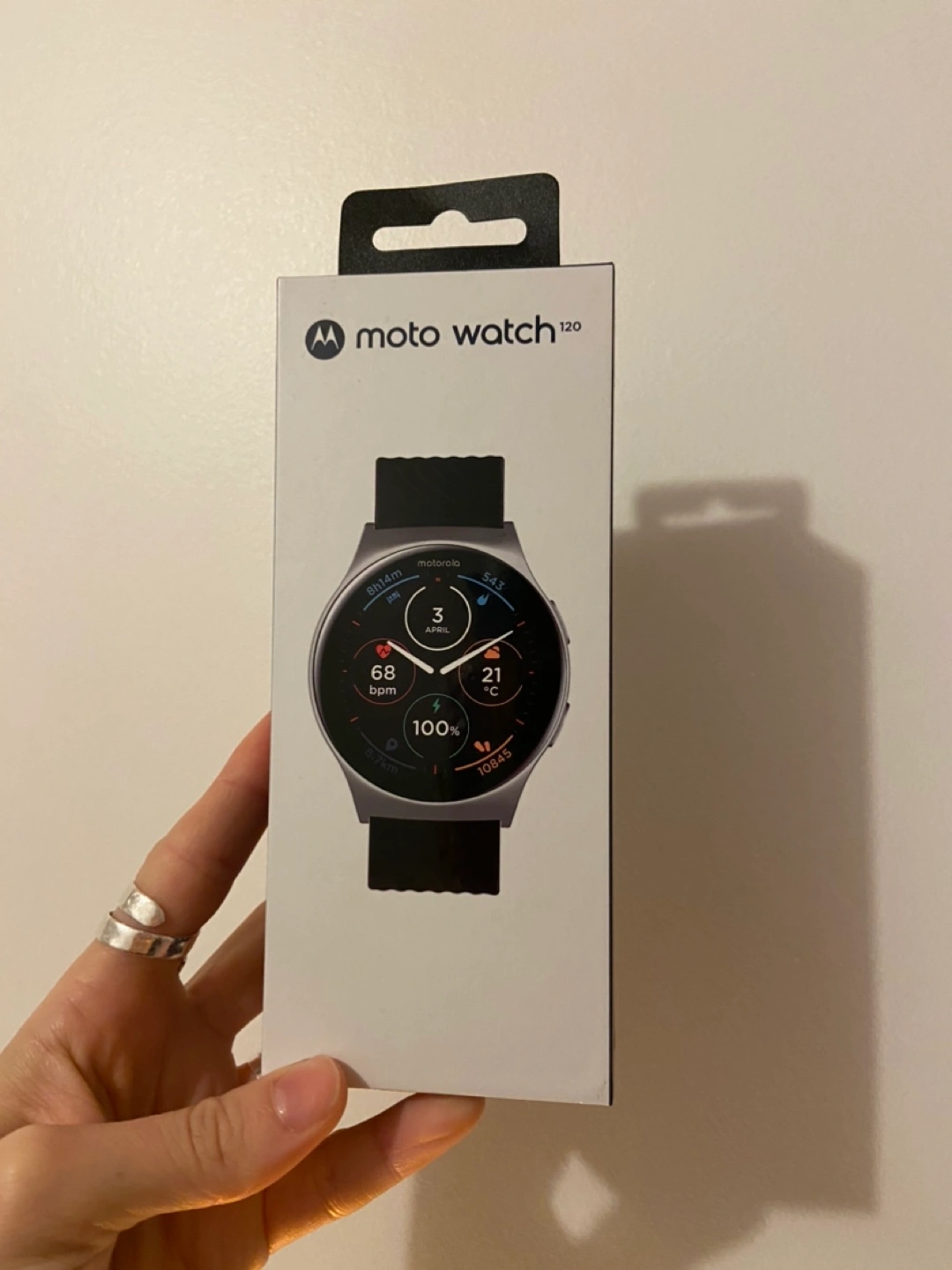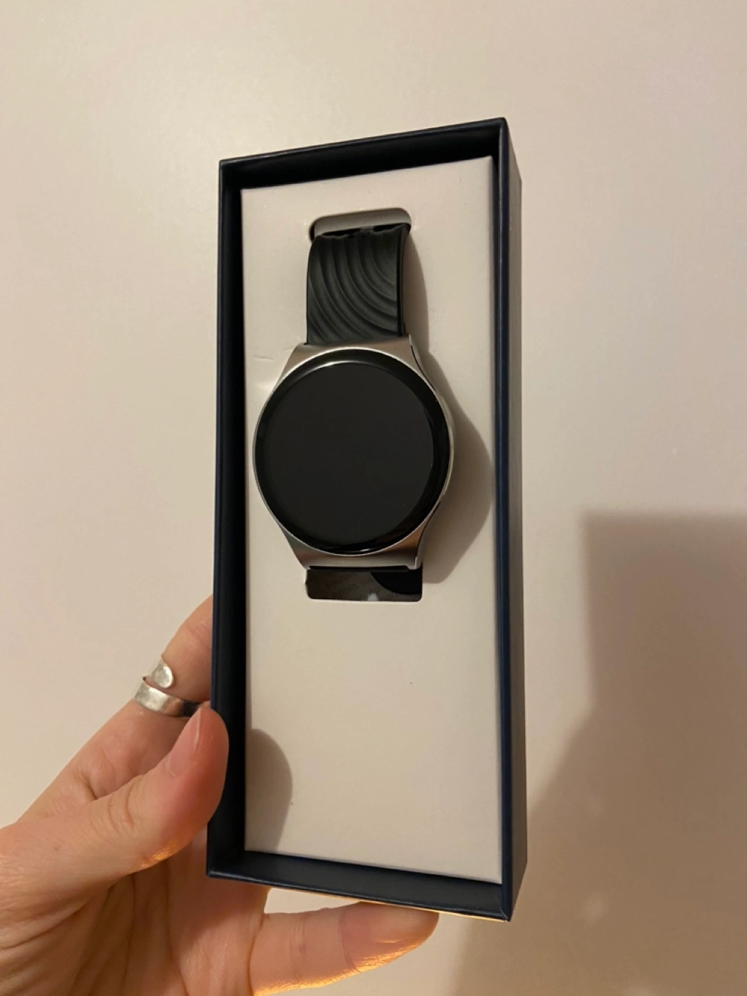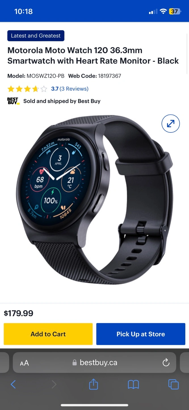 Black smartwatch with heart rate monitor, new in box. Retails $180