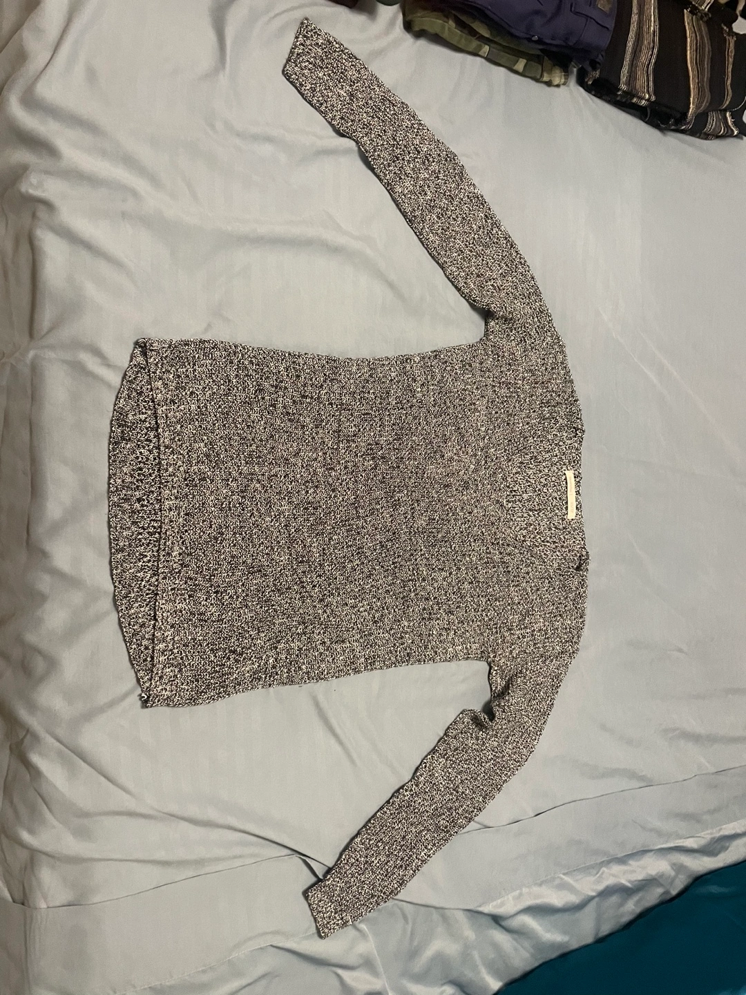 Long sleeve sweater with a v-neck and speckled black and white pattern. Size XS/TP. Cash and pick up only. Pick up location near don mills & Eglinton