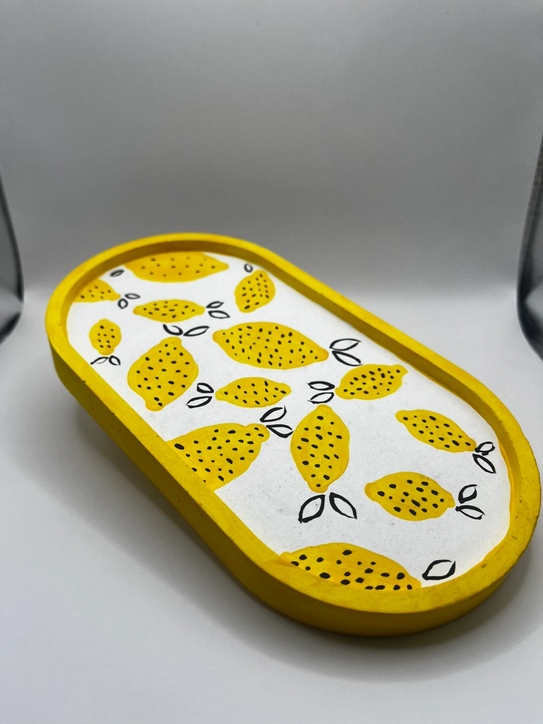 Handmade Oval tray with yellow border and lemon print perfect for your jewelry.
