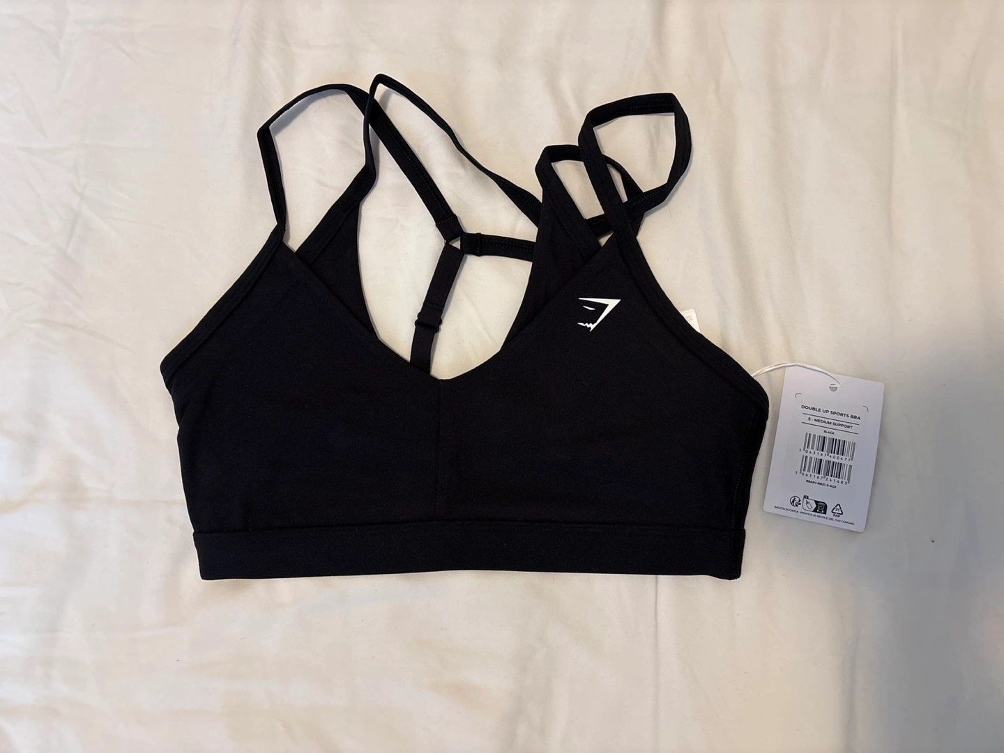 Black Crossback style with a deep V neck sports bra. New, never wore and the label is still attached.