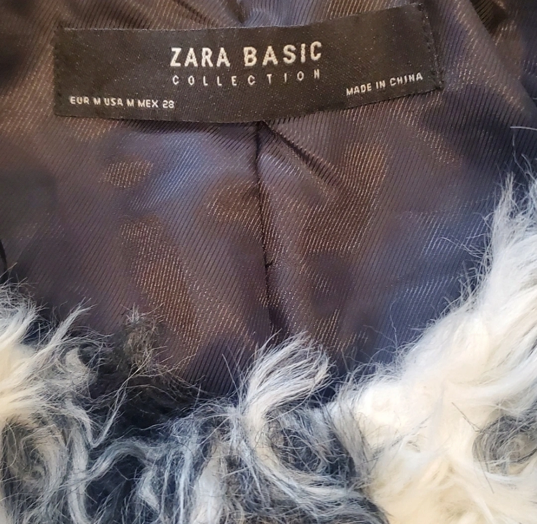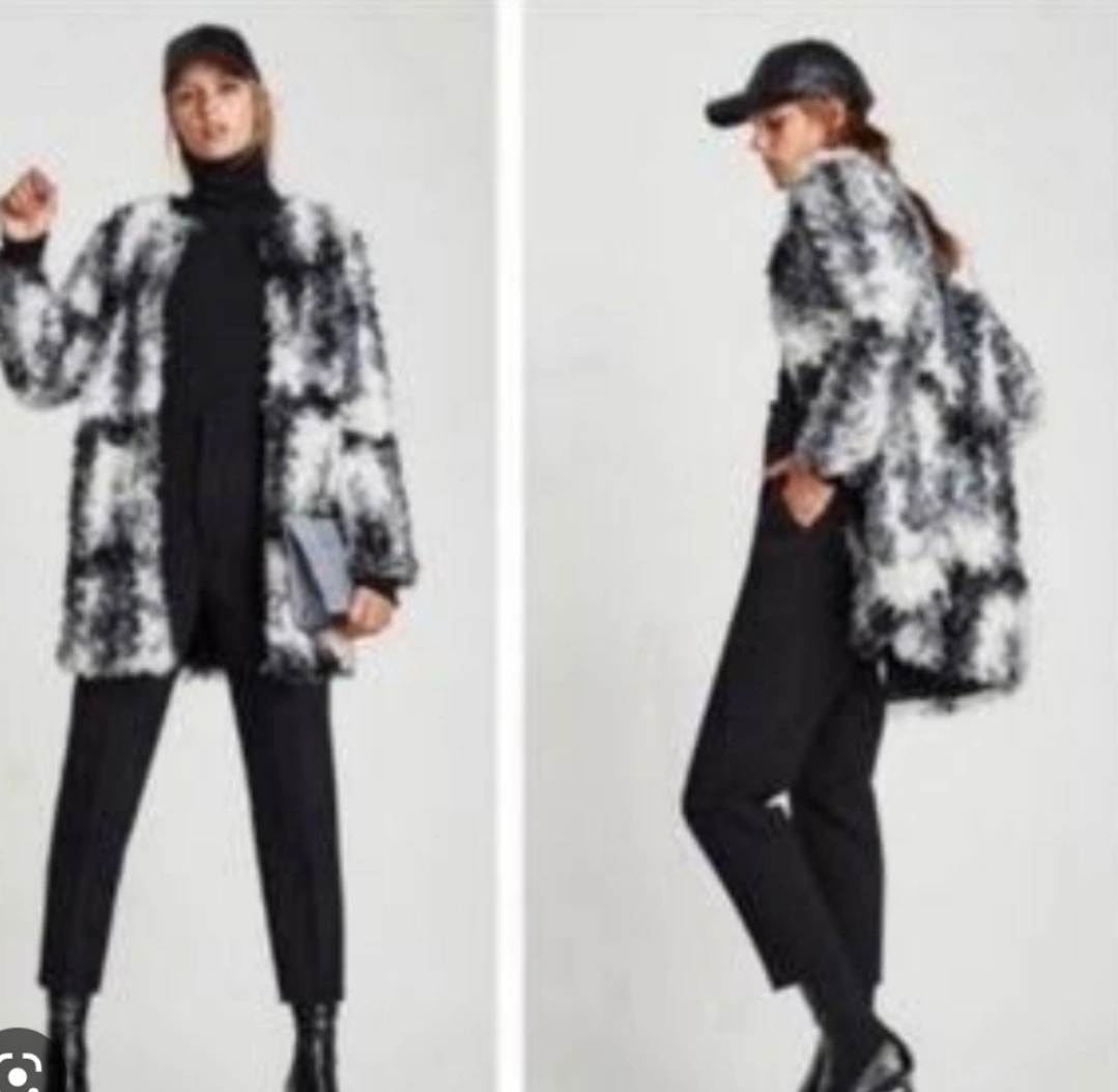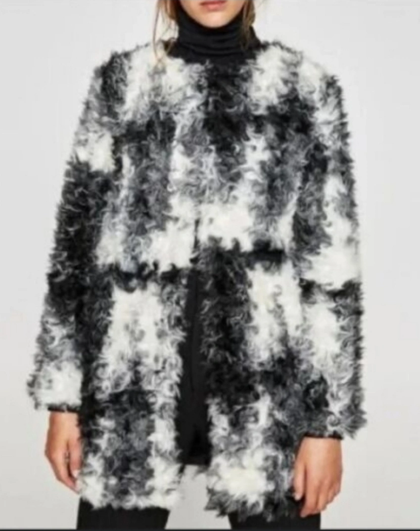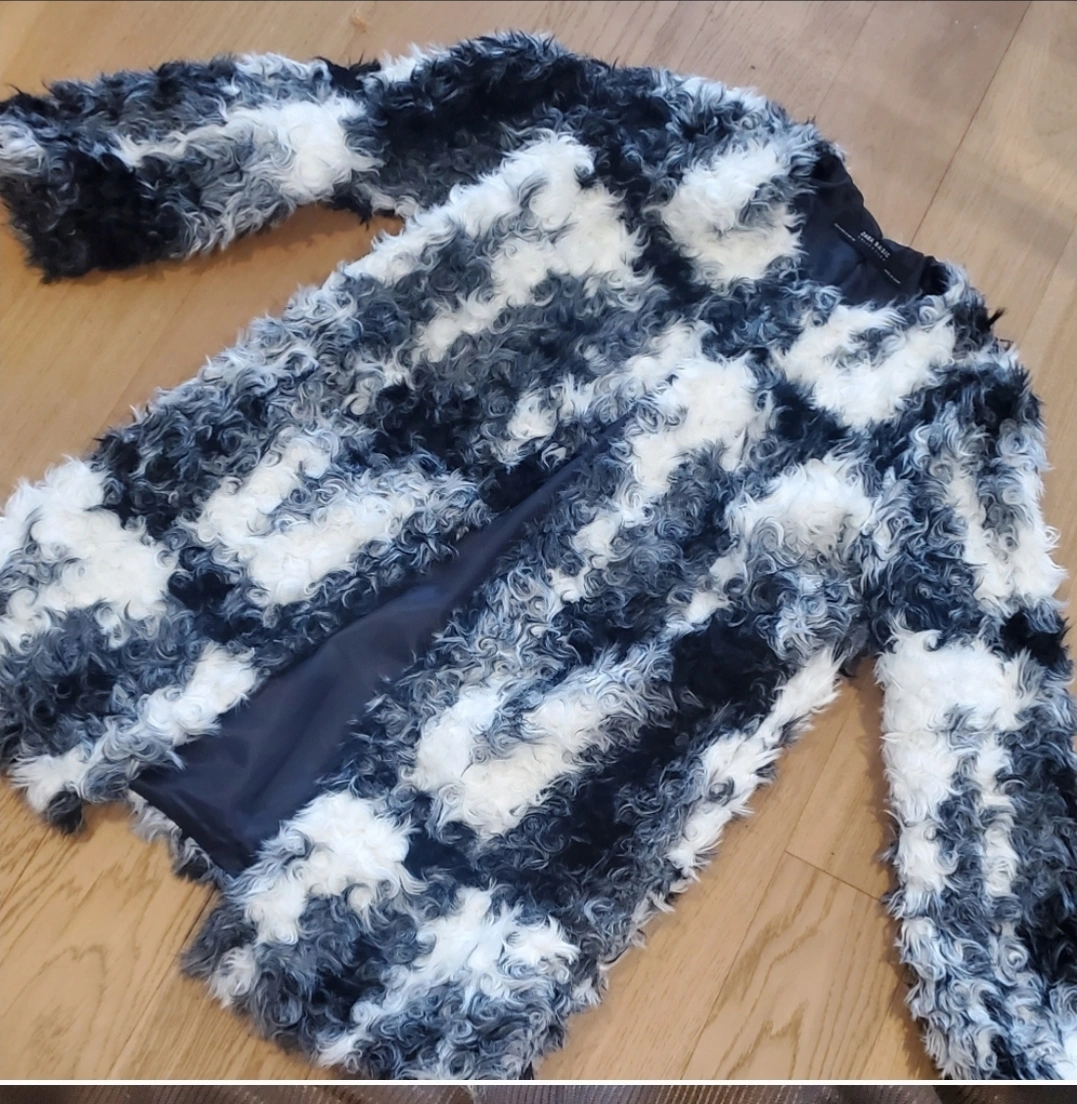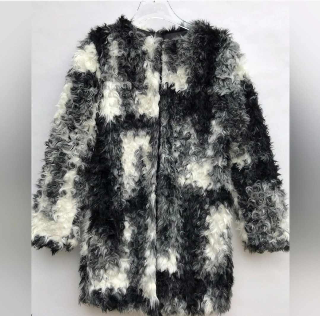 Black and white faux fur coat, size M. Long sleeves, pockets, and a classic collar.