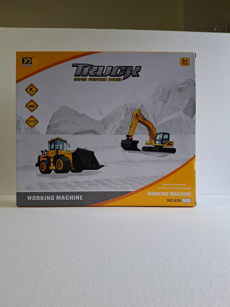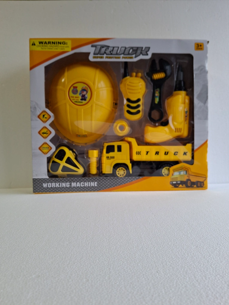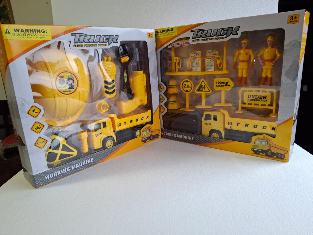 The Truck Super Friction Power set contains a truck, helmet, drill machine, wrench, walki talki, etc. This can be combined with the other set in the picture and make a complete set of construction.