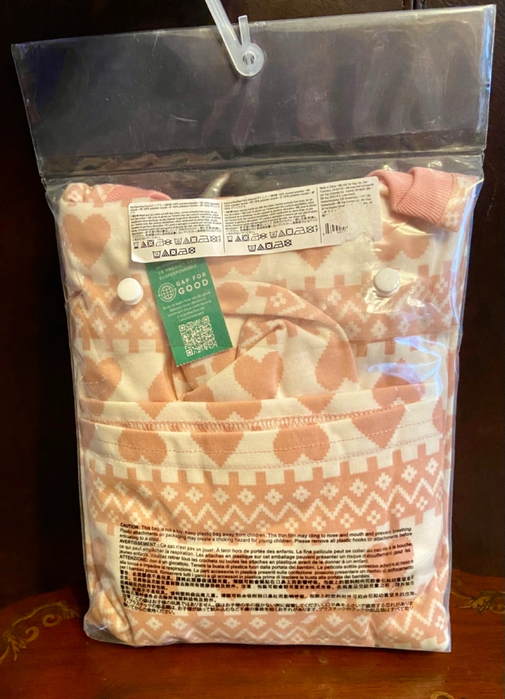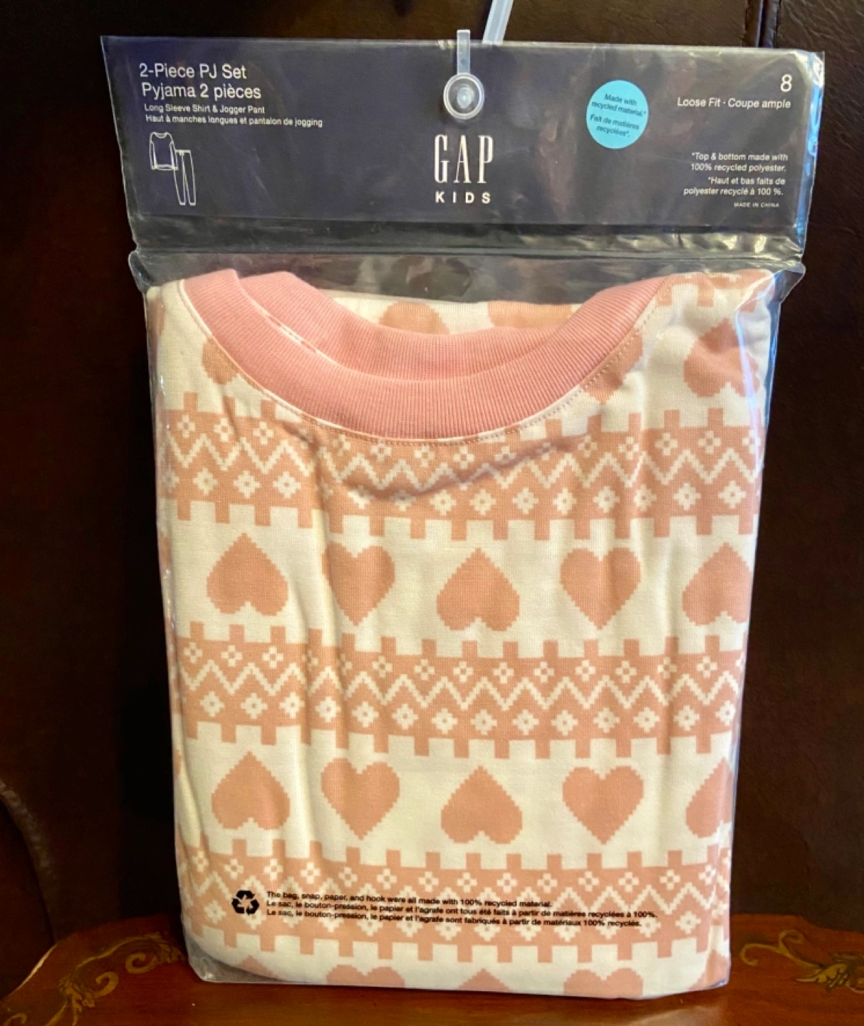 Pink and white patterned pajama set. Loose fit. Size 8. Long sleeve shirt and jogger pants. Brand new in package Cute Valentine’s Gift 💝