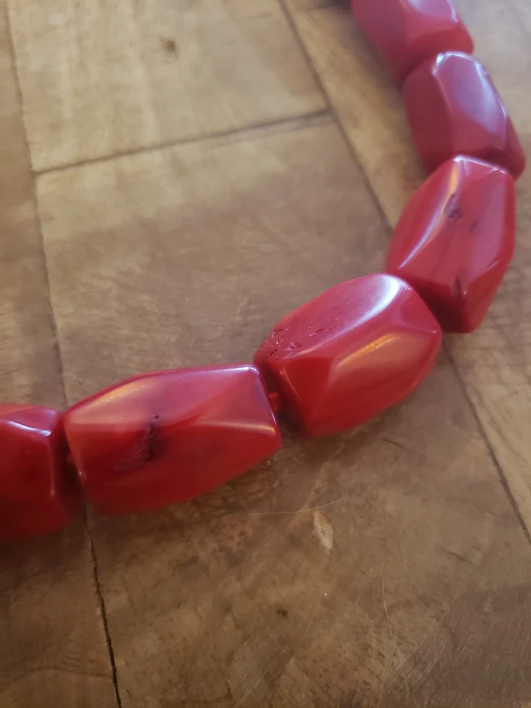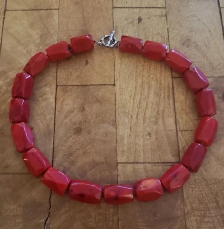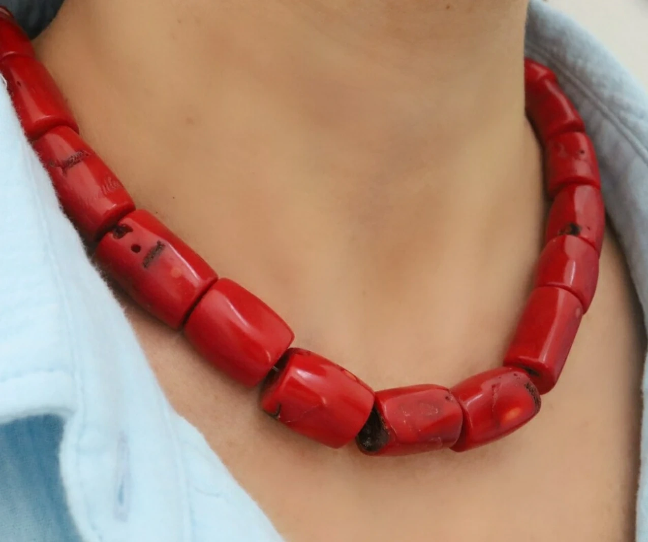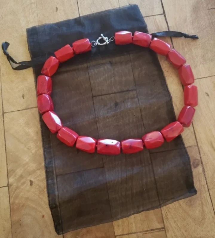 Large red coral beaded necklace with a sterling silver clasp. Comes in a black drawstring bag for gifting. ๐