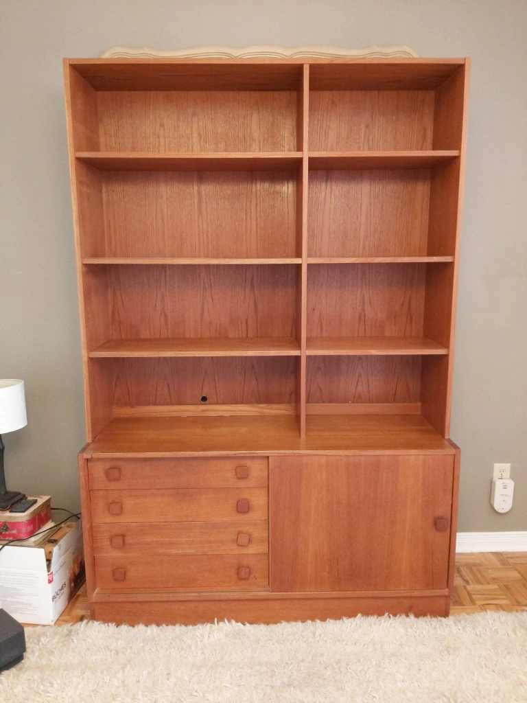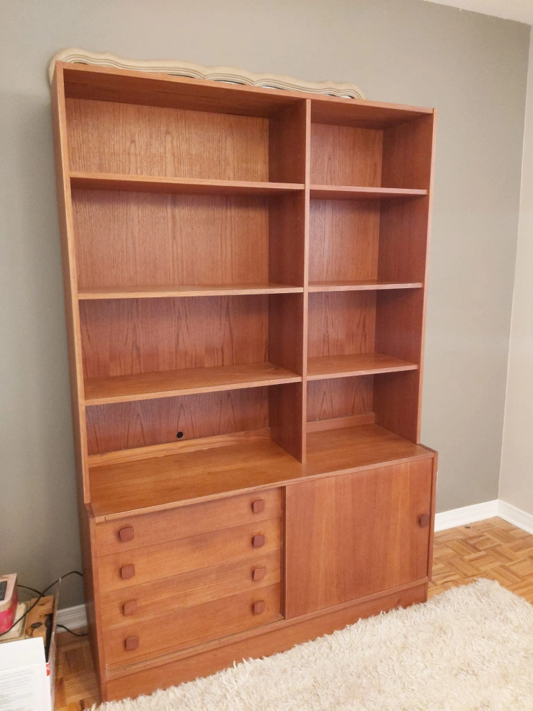 Large, solid Teak Hutch /Wall unit with shelves and drawers. Includes a sliding door and space for tableware, china, glasswares, electronics ect.Hutch is ideal for Dining Room /Living Room areas. Gently used in Very Good condition. 1970 s Vintage - MCM