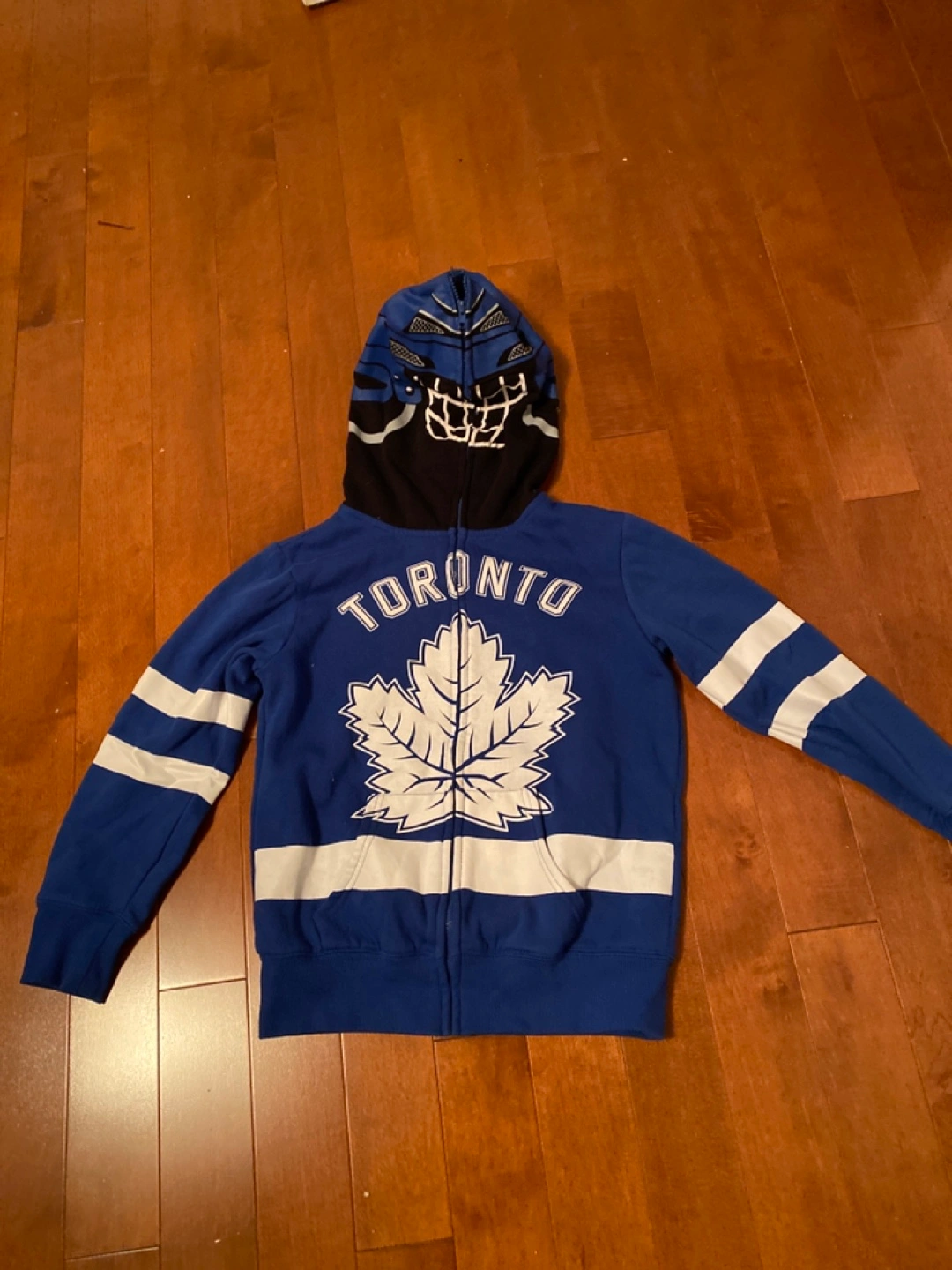 Blue and white hockey jersey hoodie with a Toronto Maple Leafs logo on the front. It has a zip-up front and a hockey mask hood.