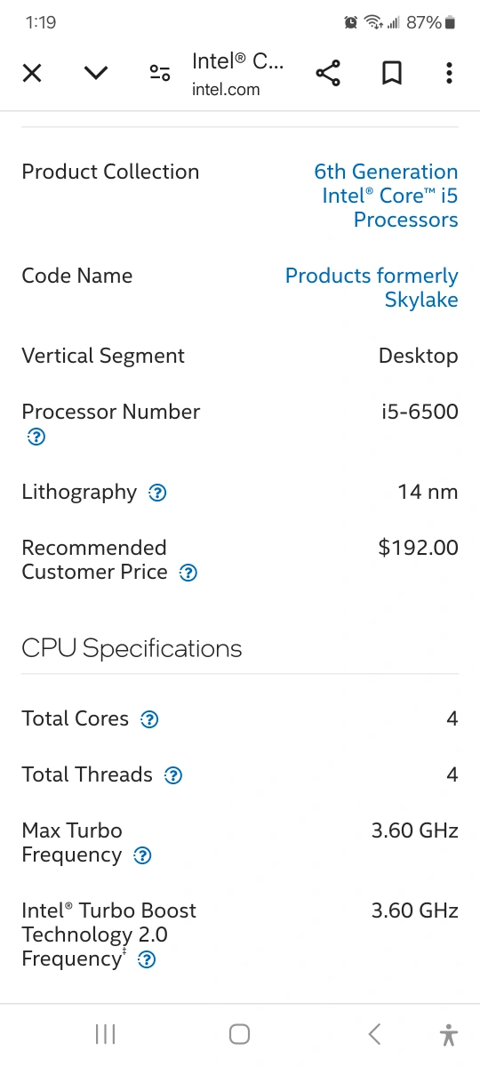 Intel Core i5-6500 Skylake processor. 4 cores, 4 threads. 3.2GHz base clock speed. 3.6GHz boost clock speed. 6th generation. pick up only Cash or Etransfer price firm