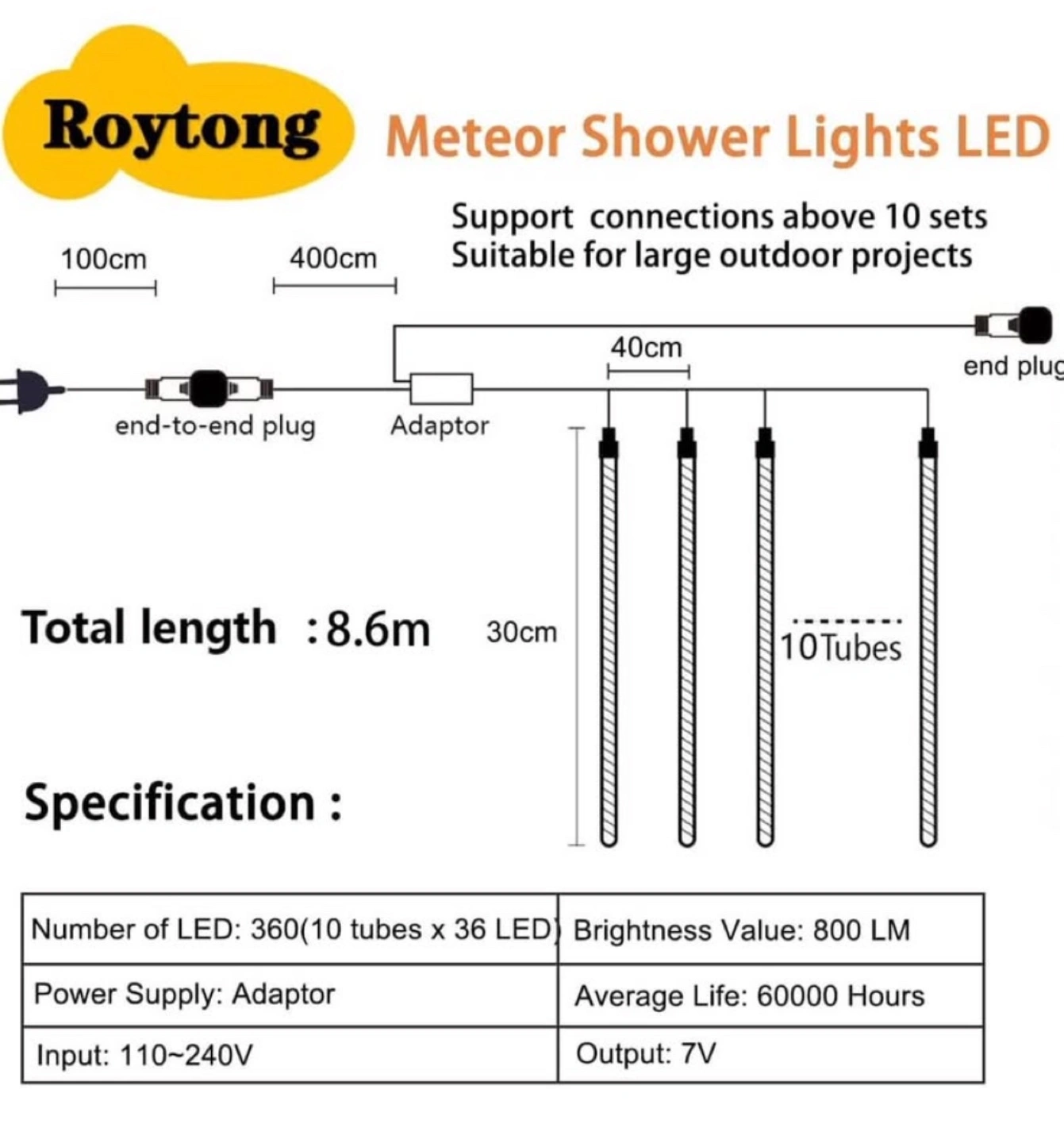 10 tubes of Meteor Shower Rain Lights. Support connections above 10 sets. Suitable for large outdoor projects. Green color and purple available