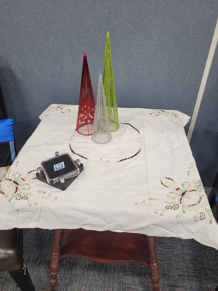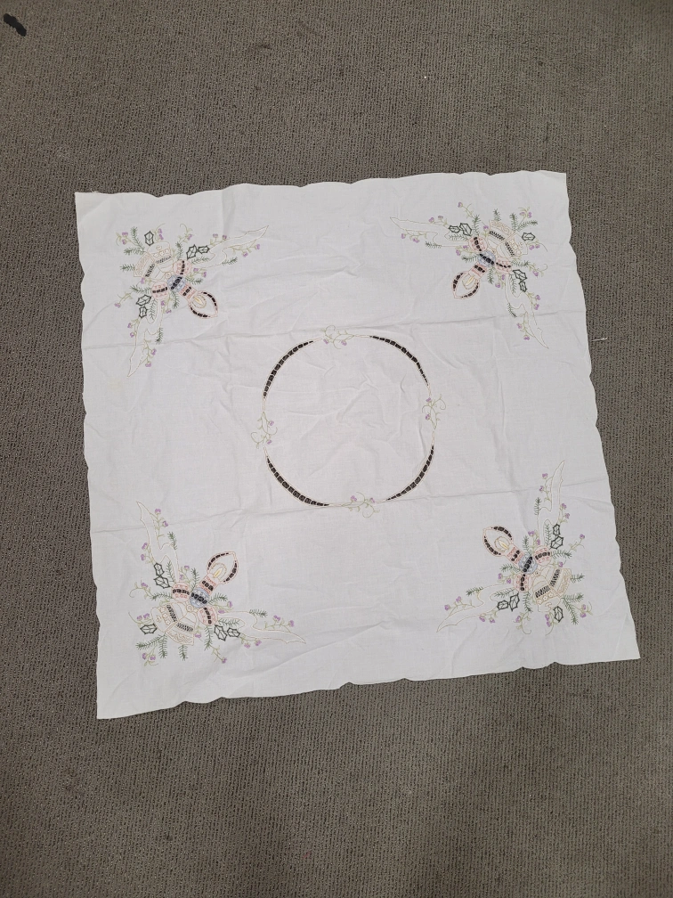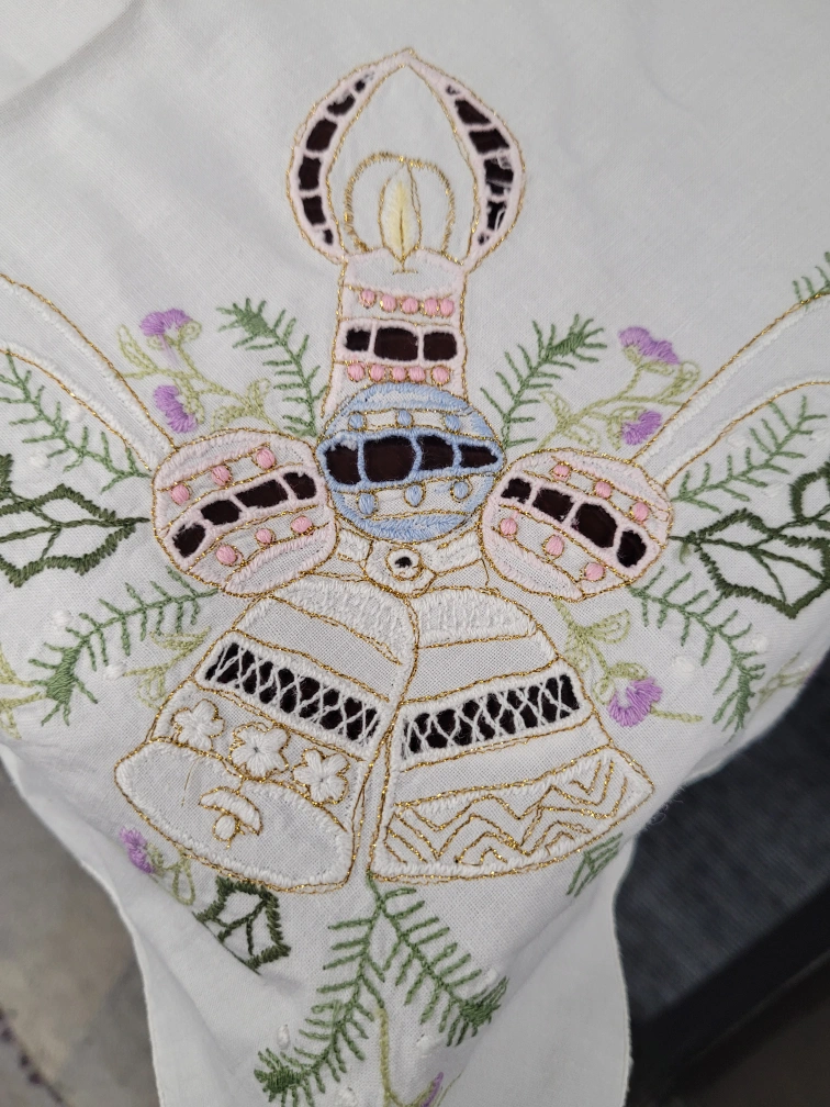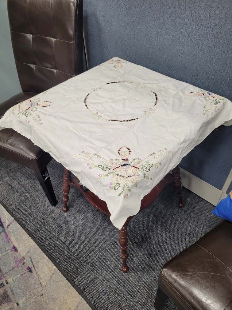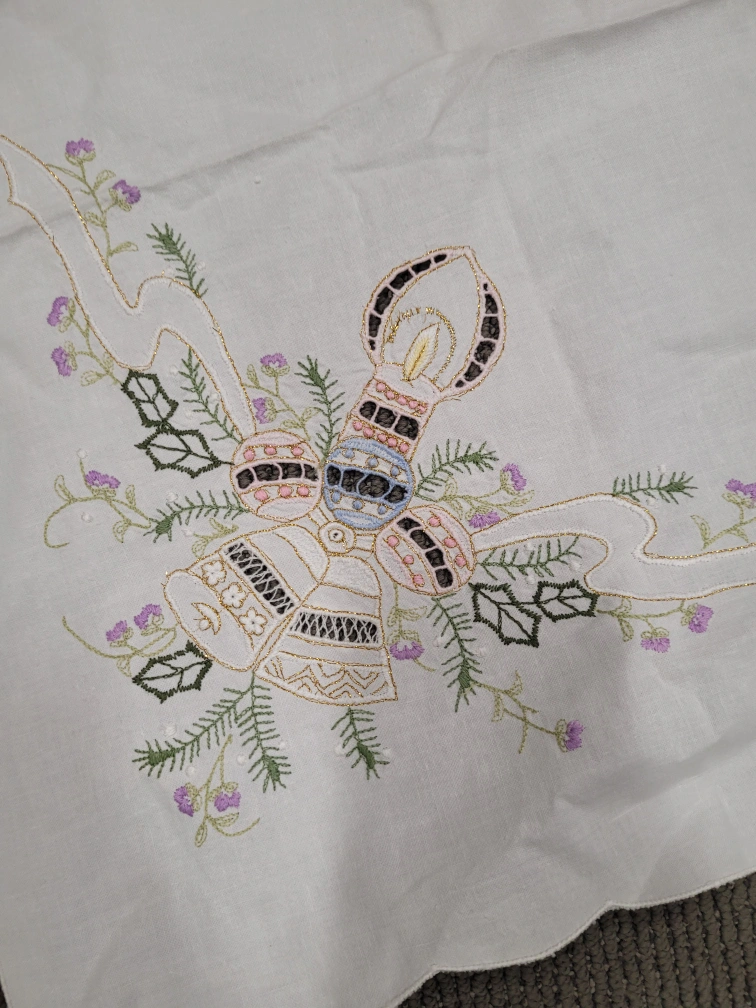 White tablecloth with embroidered Christmas bells and candles. The tablecloth is square and has a circular pattern in the centre. Must pickup. Please. no etransfer or long holds. this is a cash price. bring cash. This is in storage and I will meet you there. I can access the building during 8 to 430 Monday to Friday. No one is there outside of those times.