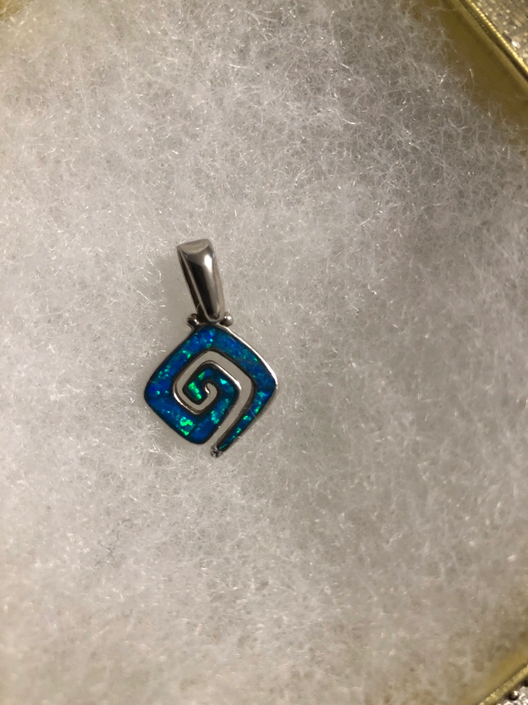 925 Silver pendant with blue opal stone. Square shaped with a spiral design.