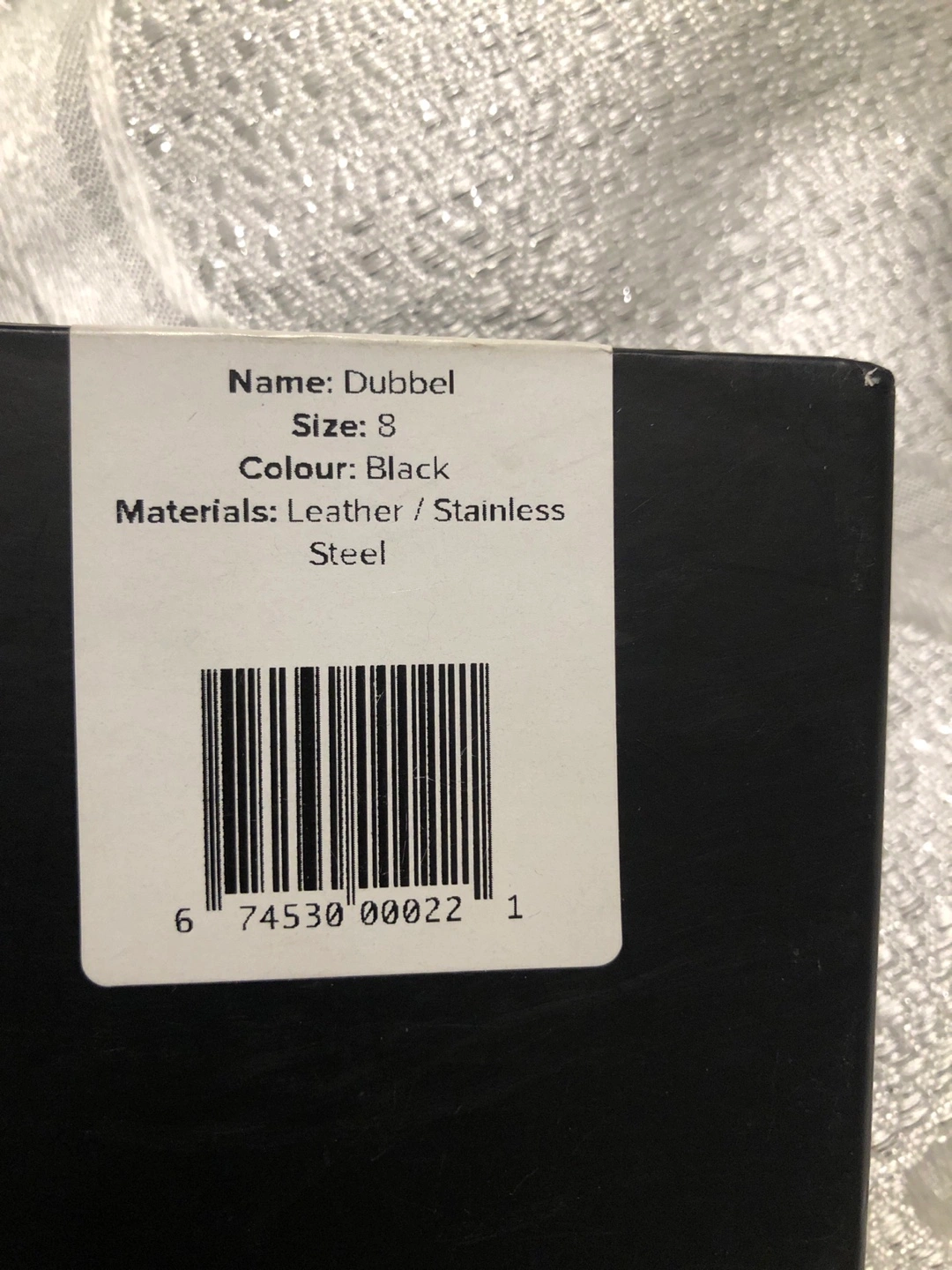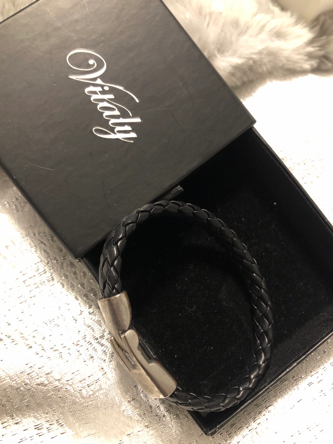 Black leather bracelet with stainless steel clasp. Size 8. Some tarnishing on inside of clasp.