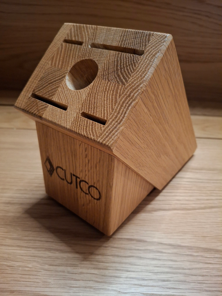 Wooden knife block with 5 slots for knives. Has a round hole for a sharpening steel or scissors and a bottom rubberized base. Made in the USA. Cutco comes with a warranty for free replacement