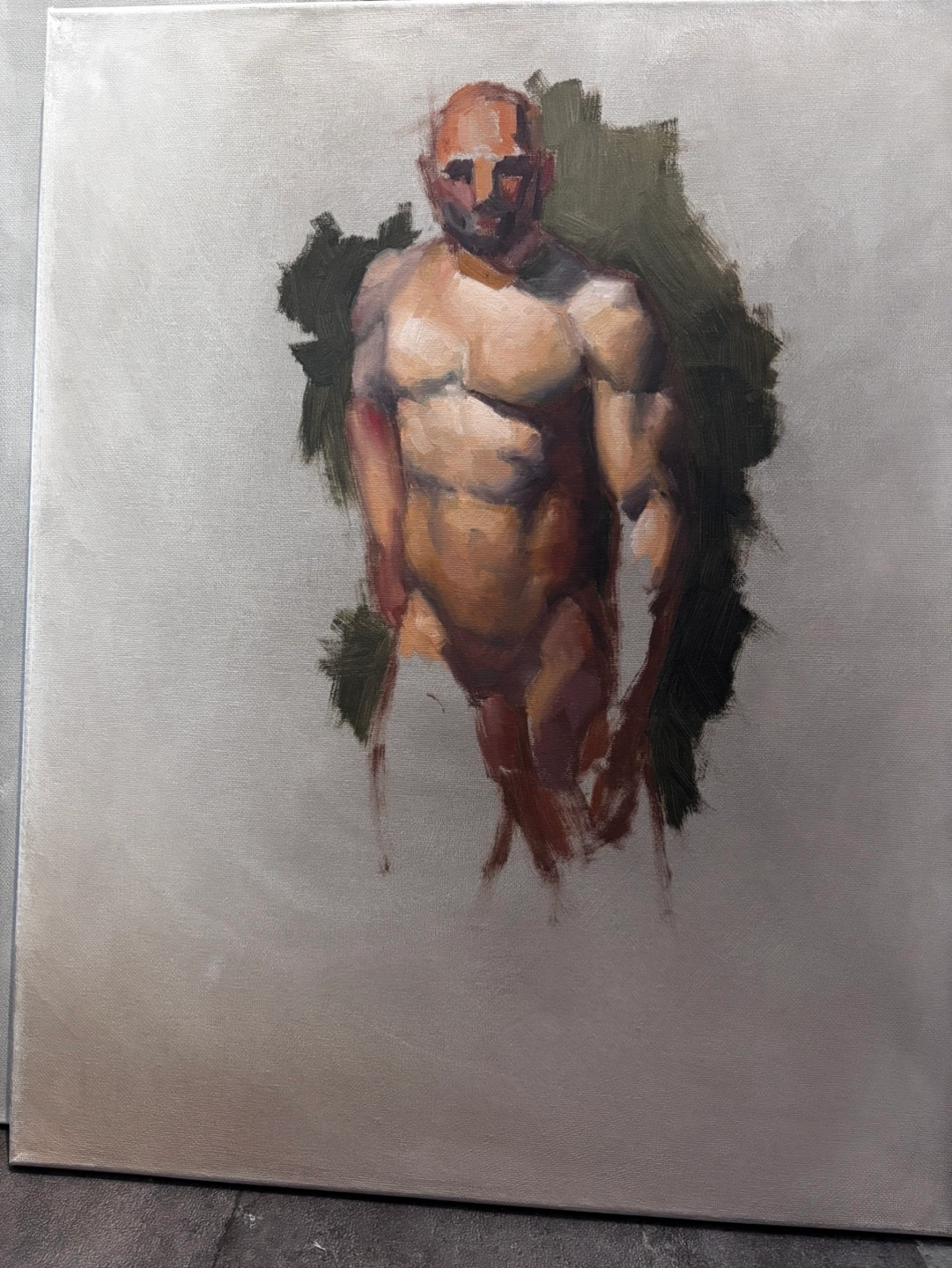 Original all prima oil sketch on canvas from life. Male figure with a green background. Signed at the back of the canvas.