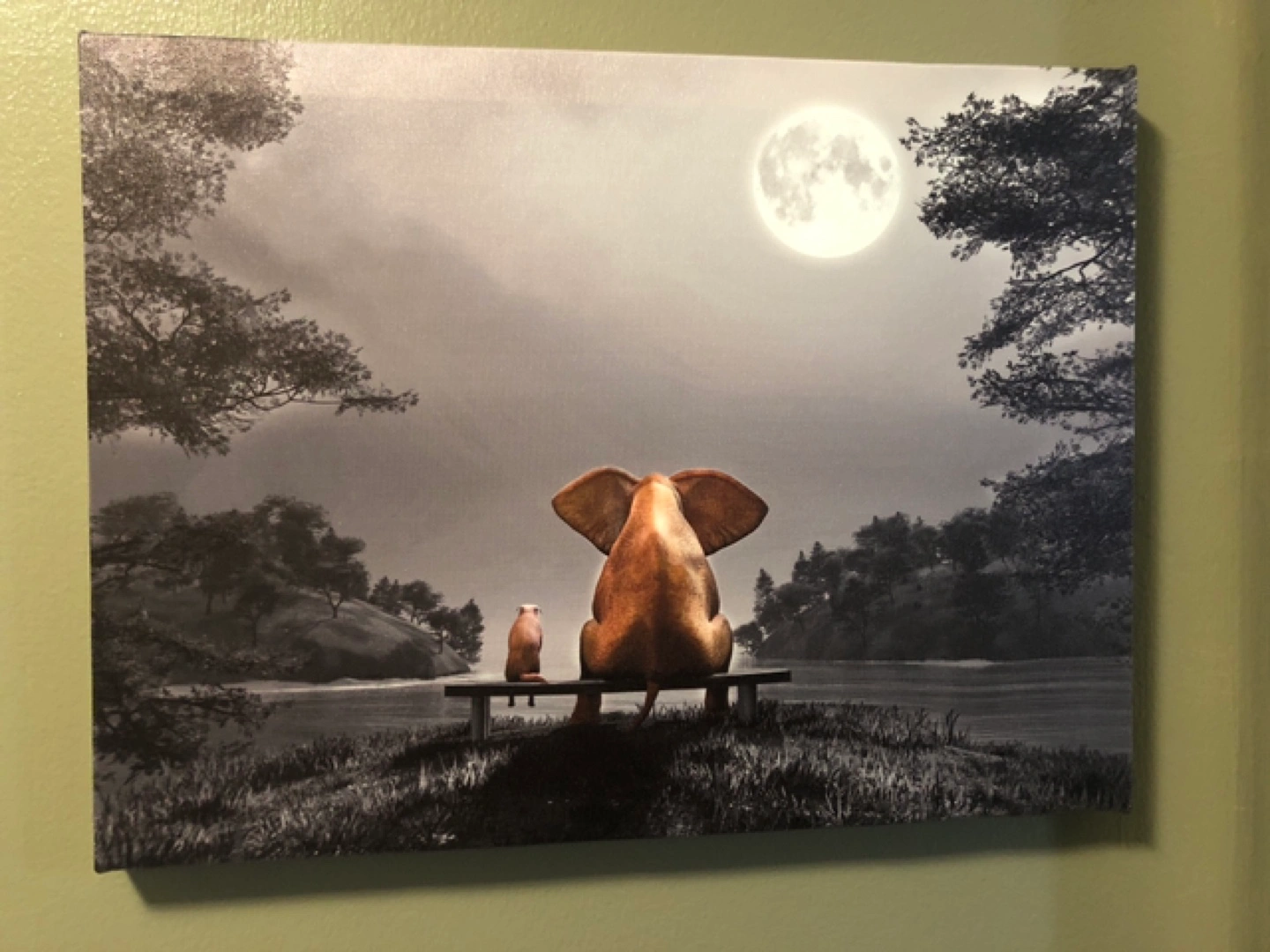 Canvas wall art with a brown elephant and a dog on a bench under the moon.