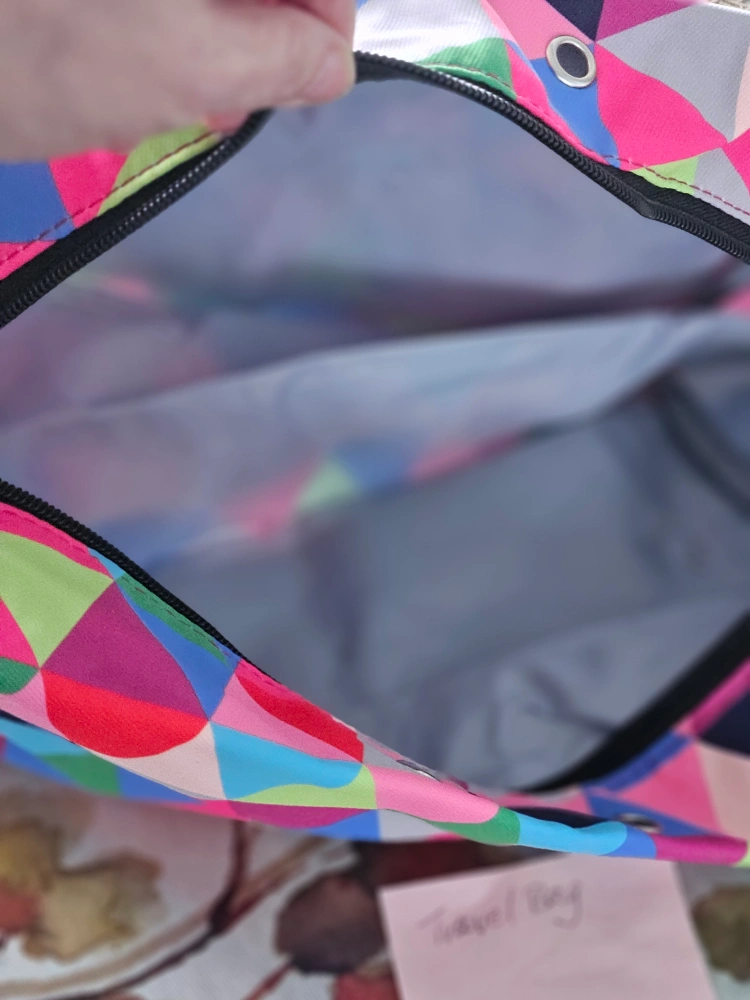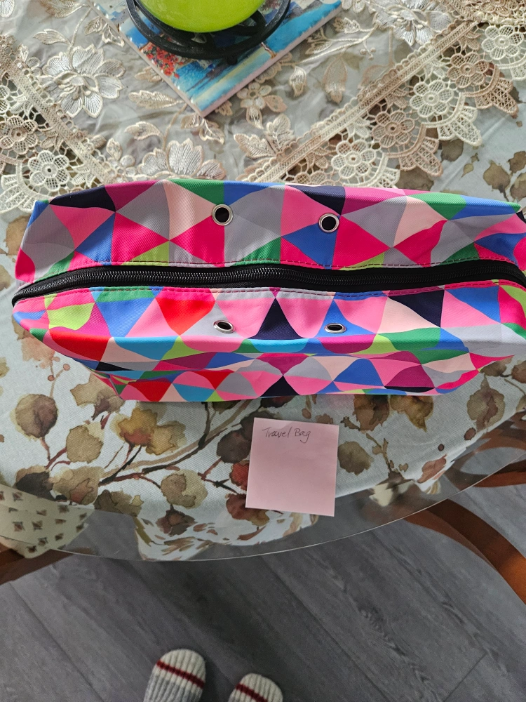 Multicoloured travel bag with zipper closure. Two compartments with black zippers. Great for toiletries or use as a shoe bag. Pick up only in Malton area of Mississauga (Airport Rd and Morningstar Dr). Cash only, no etransfers. (11"W x 7"H)