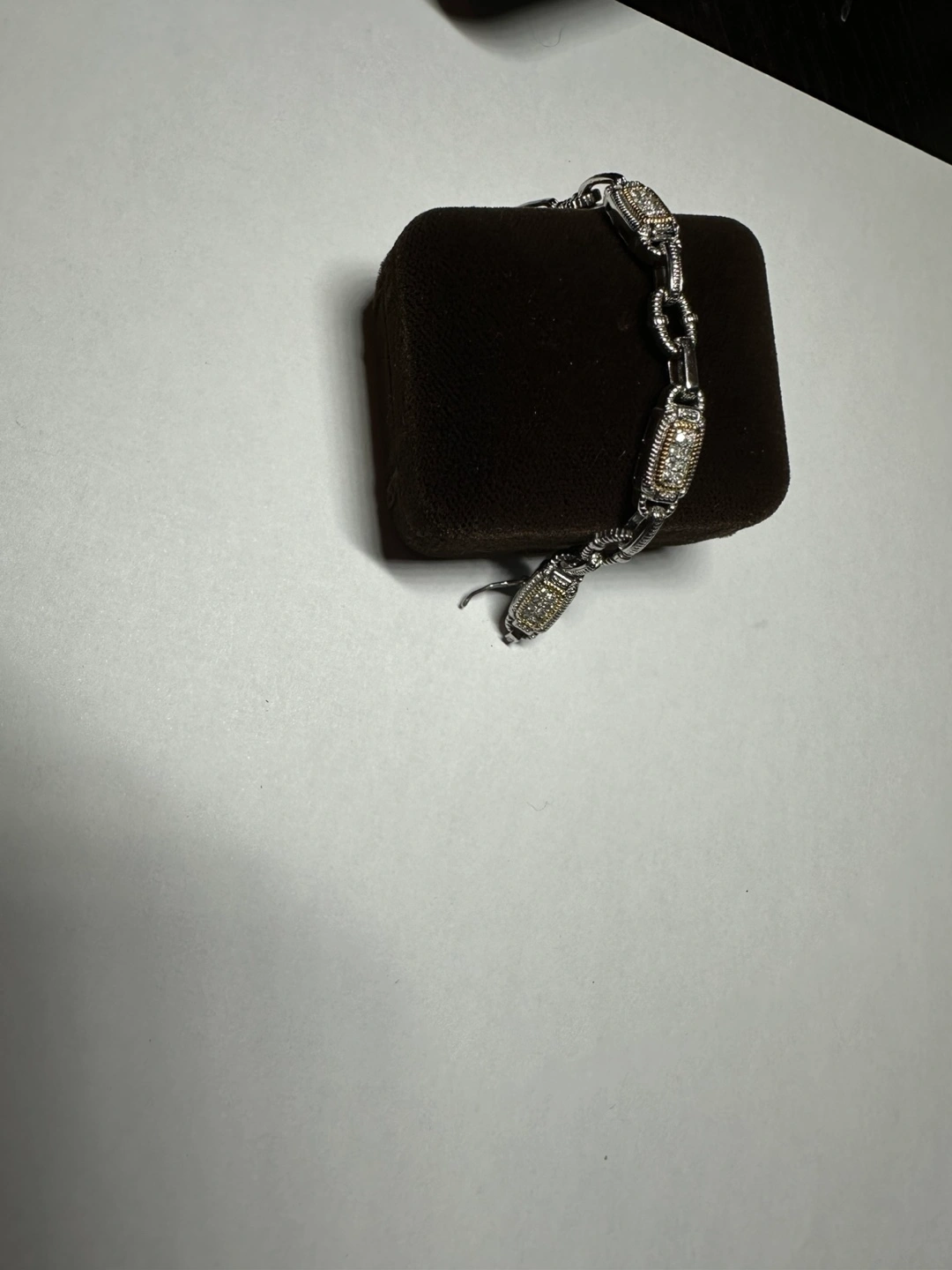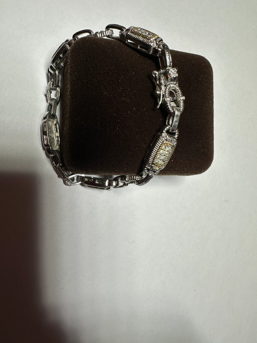 Stunning Silver bracelet with cubic zirconia stones. Features a linked chain design with alternating oval and rectangular gold plated links. The rectangular links feature a cluster of cubic zirconia stones each. Clasp closure.