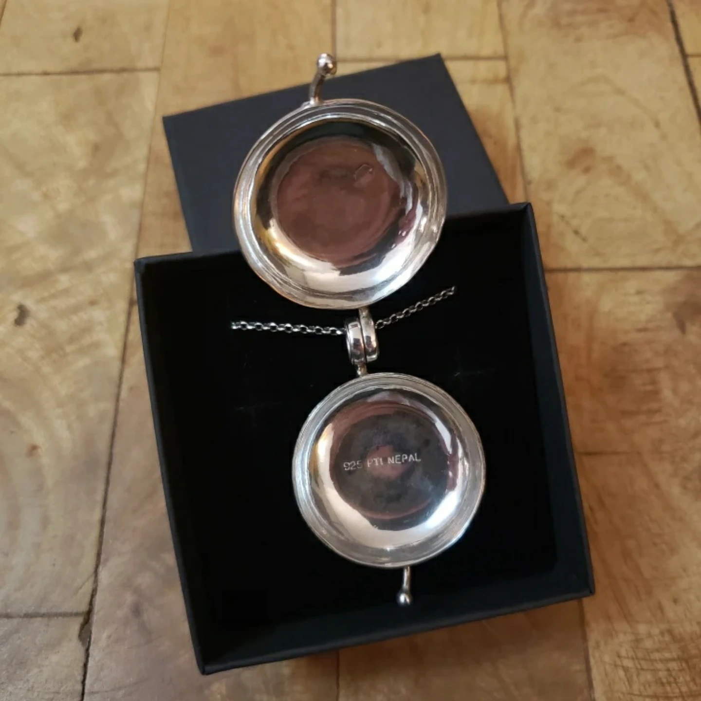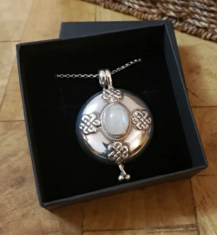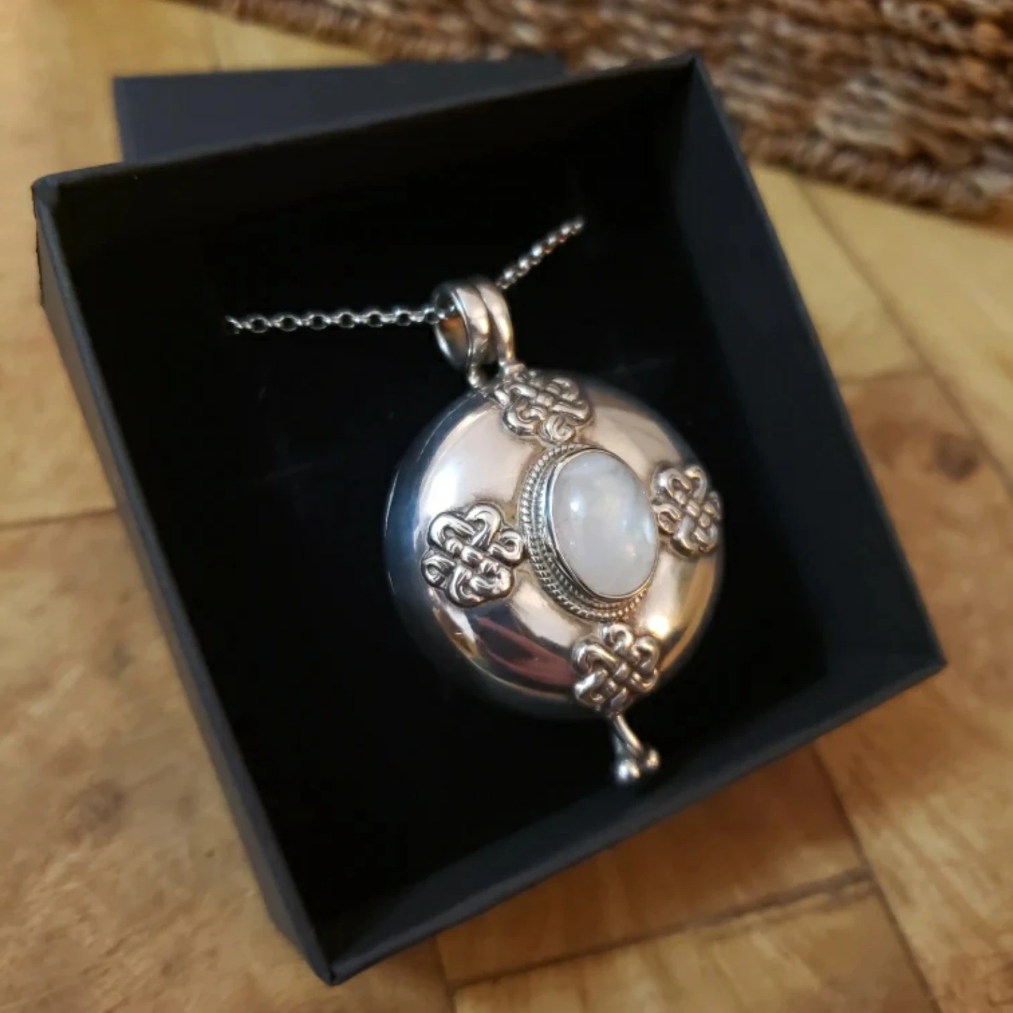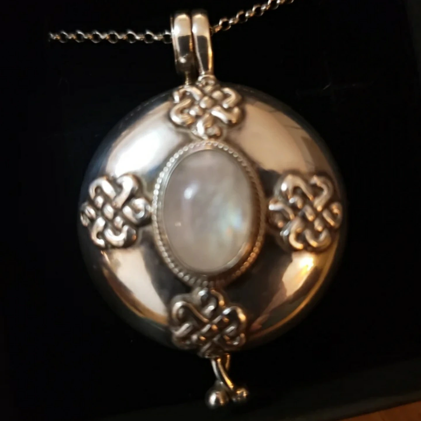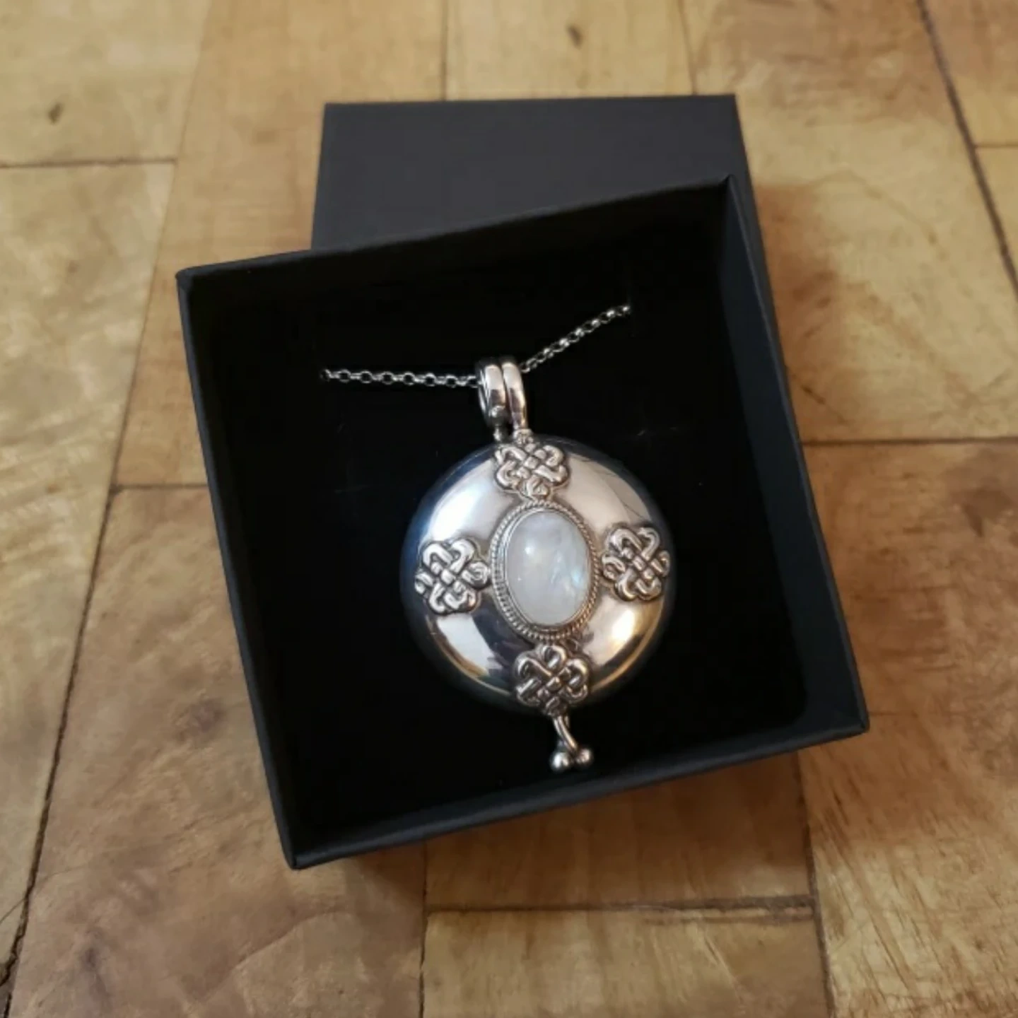 Sterling silver large locket necklace with moonstone and celtic engraving. 36 inch silver chain. Comes in a black gift box.