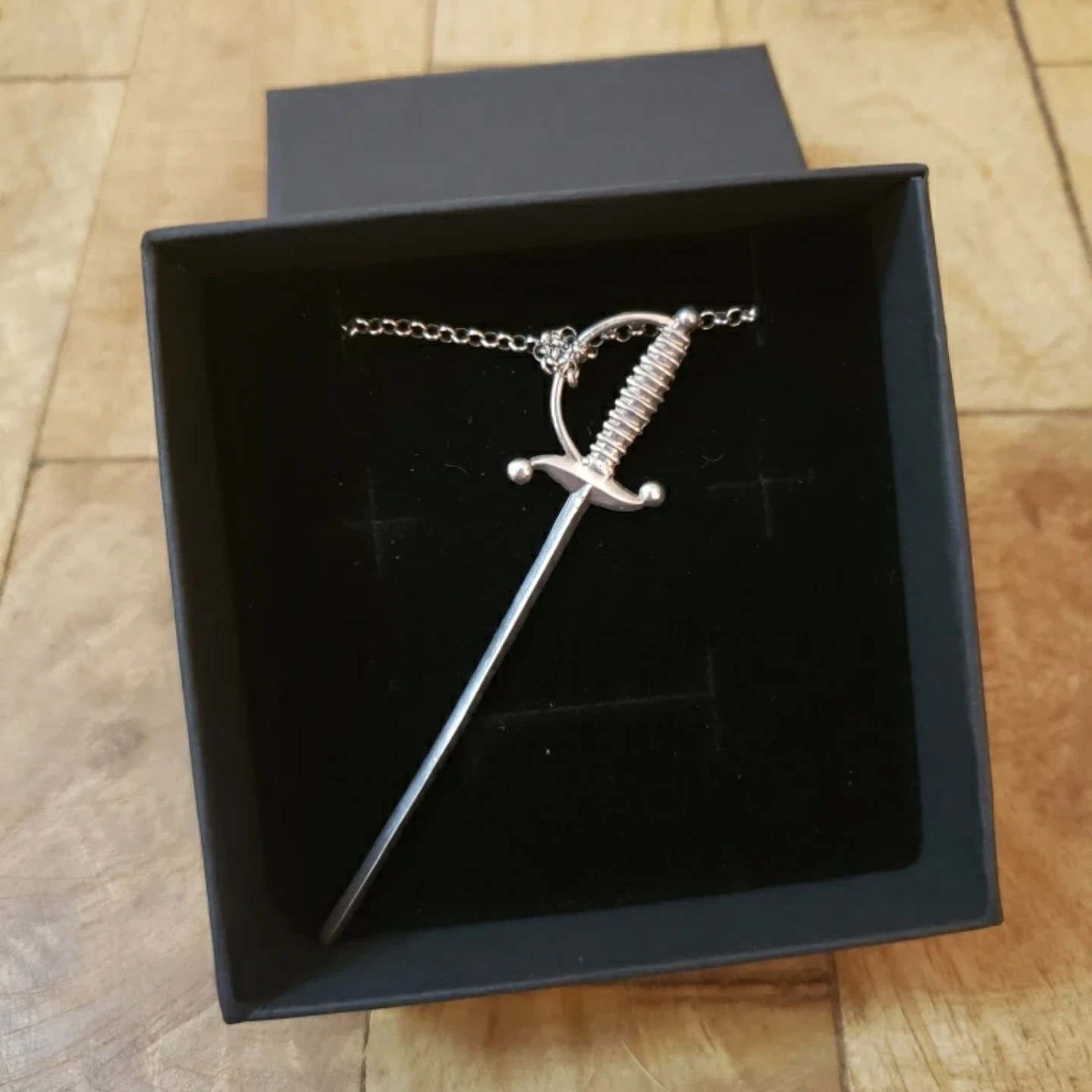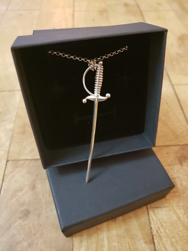 Sterling silver sword pendant necklace. 26 inches long. Comes in a black gift box.