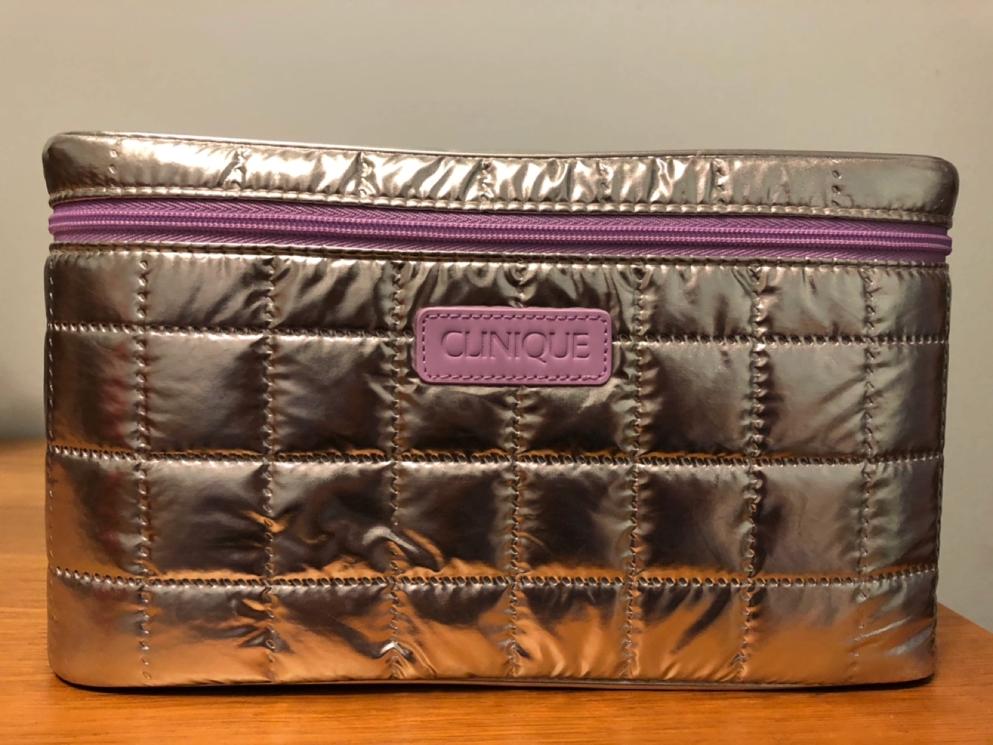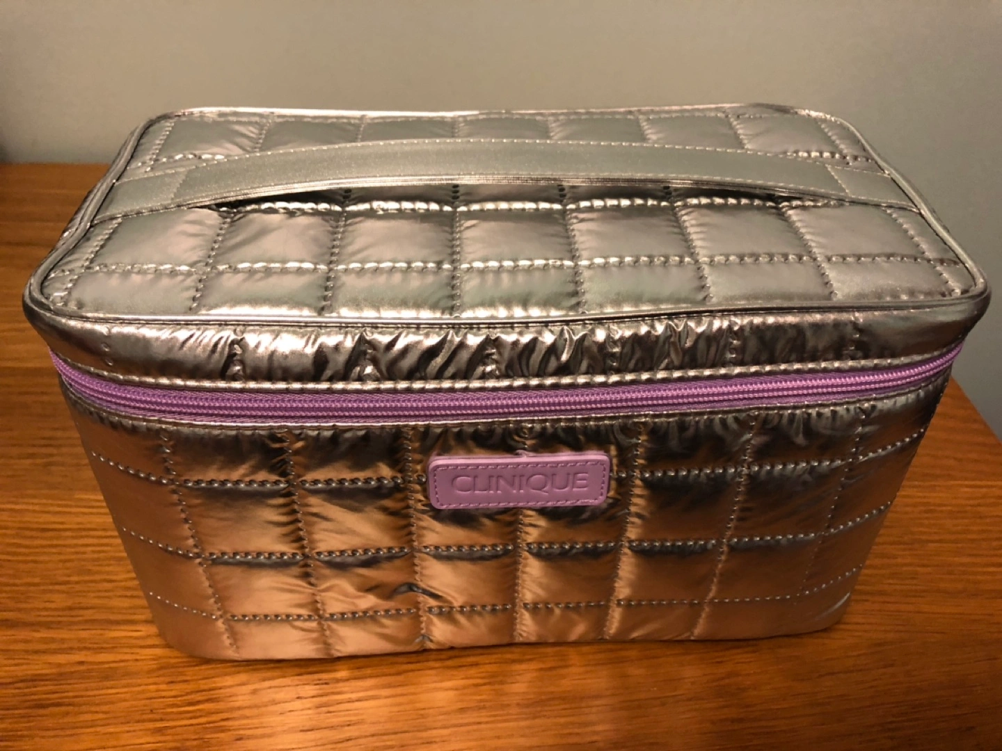 A brand new Silver quilted makeup bag with a purple lining and handle. It has a zipper closure. Please pick up after 4:30pm during the week days at Christie station