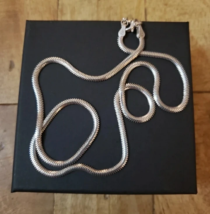 Sterling silver snake chain necklace. Chain is 16 inches with a 2 inch extender chain for 18 inches. Comes in a black gift box.