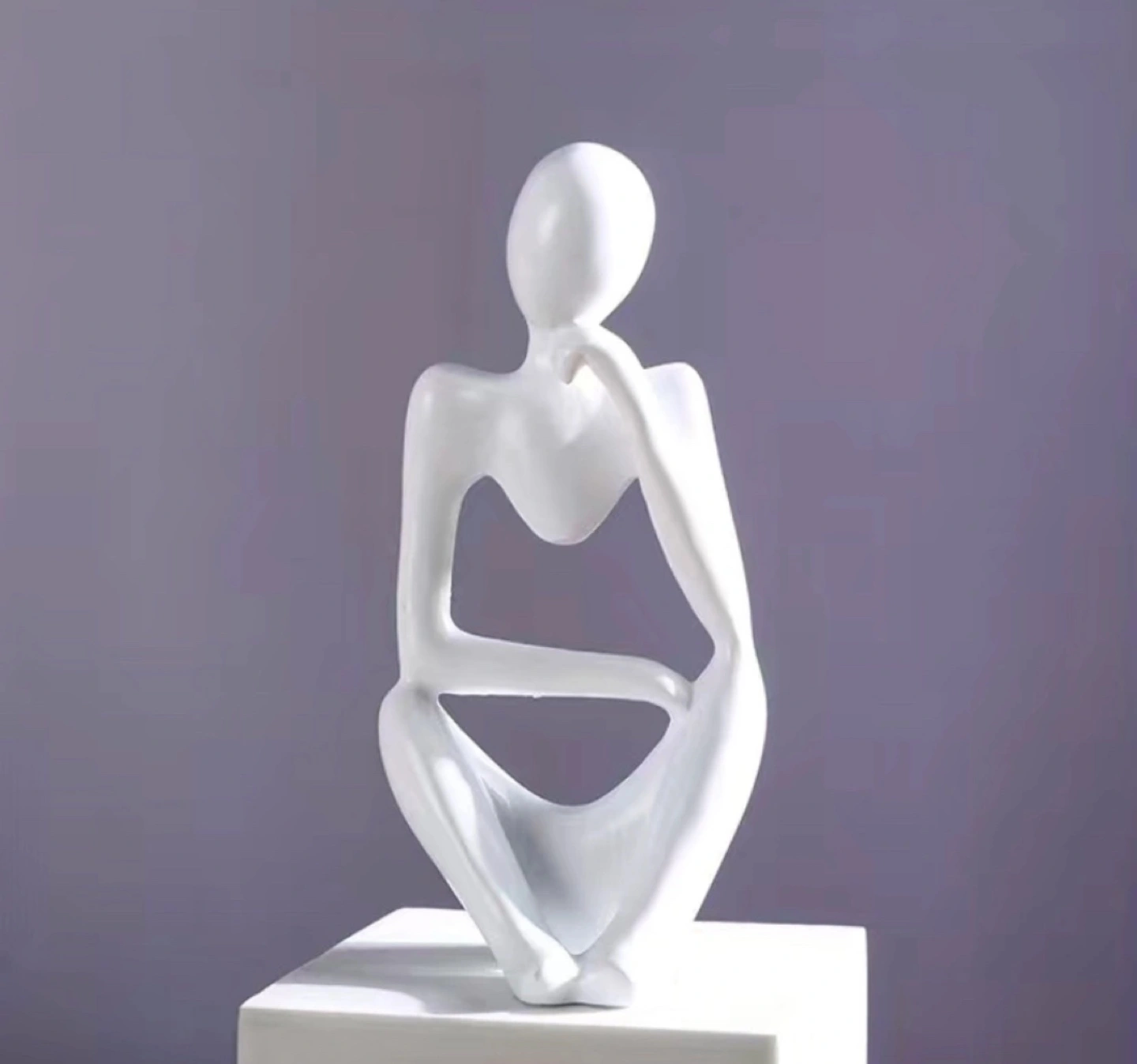 White abstract figurine, sitting in a contemplative pose. Made of a smooth, hard material.